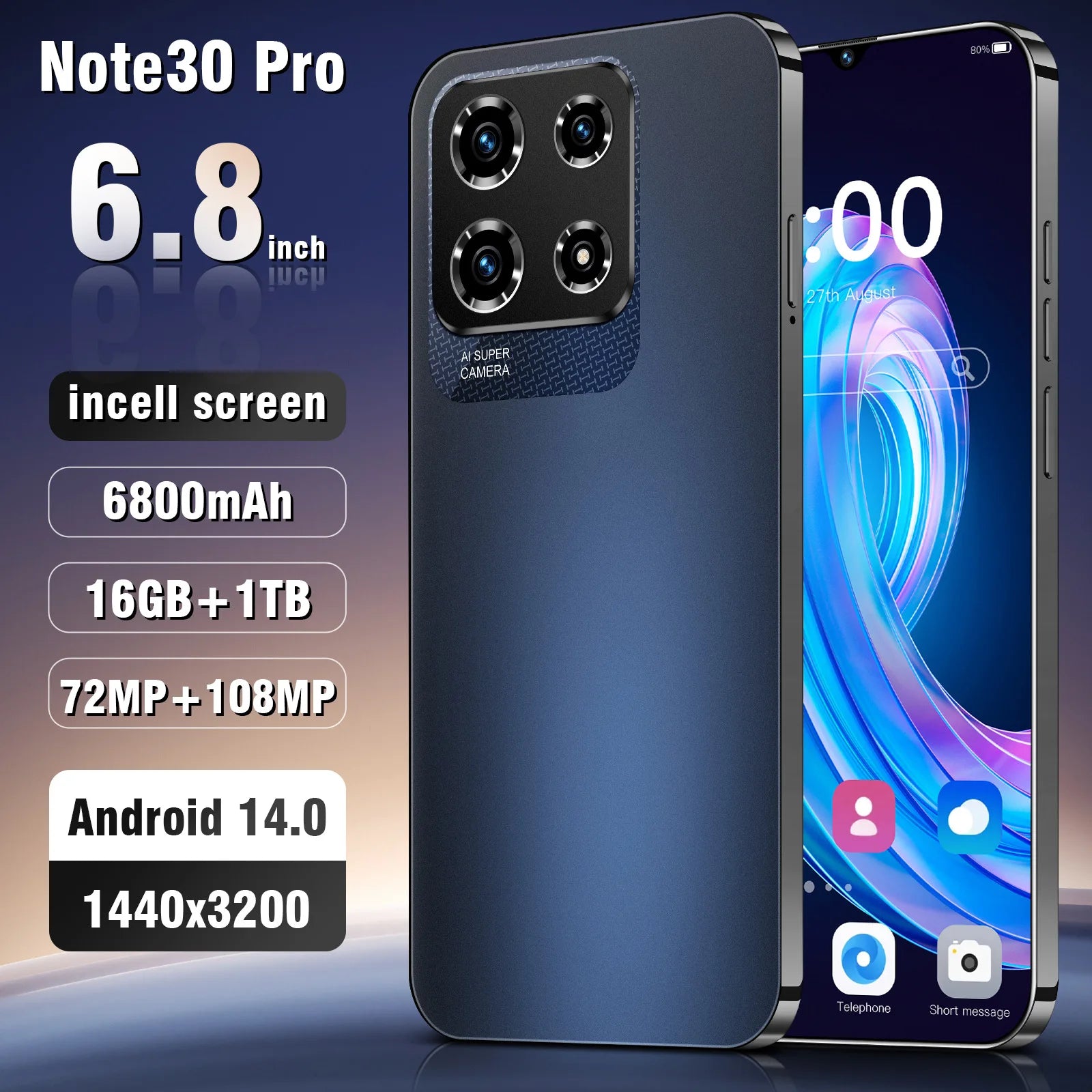 Hot Selling Note30 Pro Mode 16GB+1TB 6.8-inch 5G Camera 72MP+108MP Android 14 Fingerprint Unlock Smart Phone