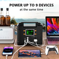 This power station has 9 outputs, allowing you to charge multiple devices at a time. The output port includes 2 110v, 300w and 350w peak pure sine wave ac sockets, a pd type-c port, 3 5v2.4ax1, U.S.B. a port of qc 3.0 0x2, 2 12v dc ports, portable generator can power drones, tablets, mobile phones, digital tablets, laptops, cameras, CDs and other devices.