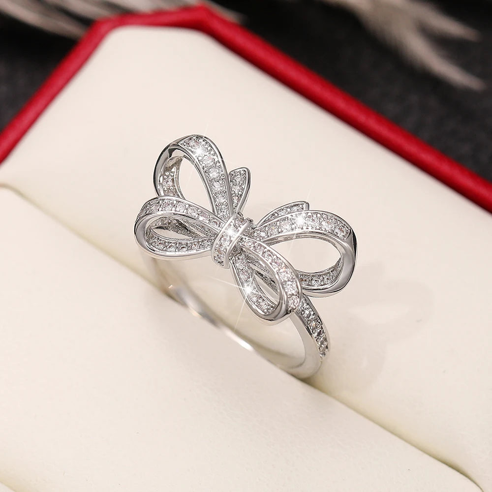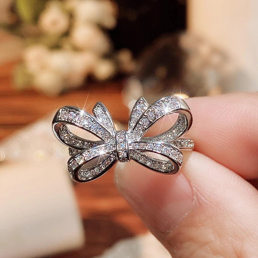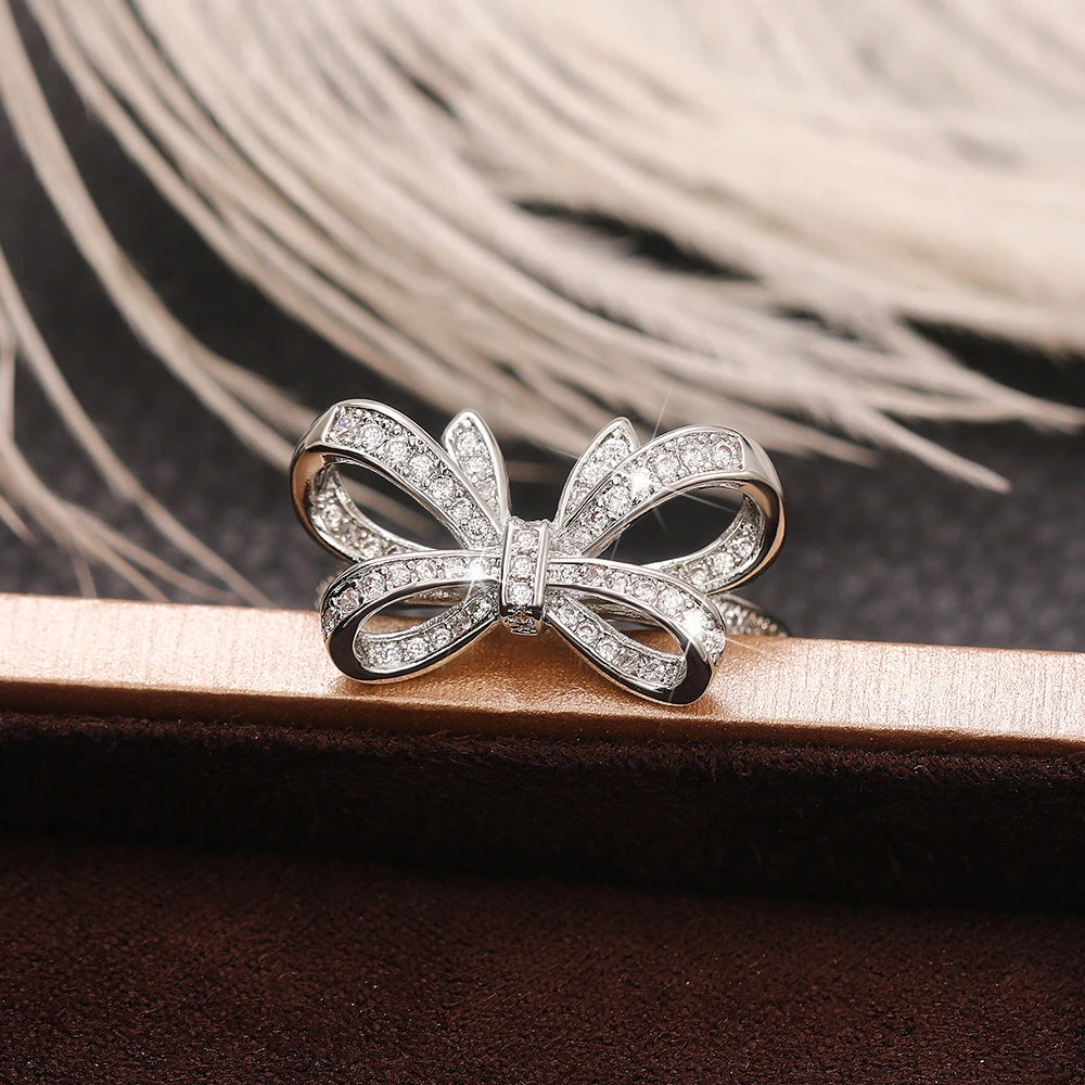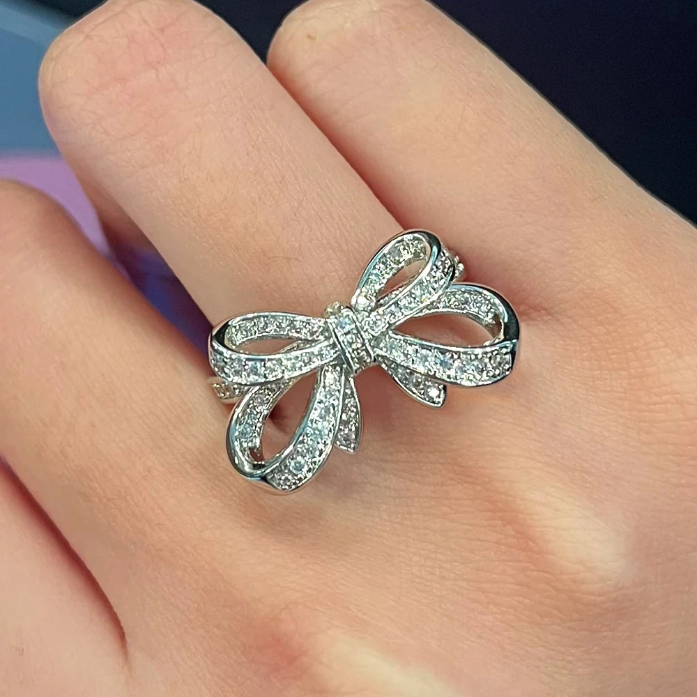 Huitan Bling Bow Rings for Women Luxury Silver Color Fashion Finger Accessories Party Anniversary Gift Romantic Female Jewelry