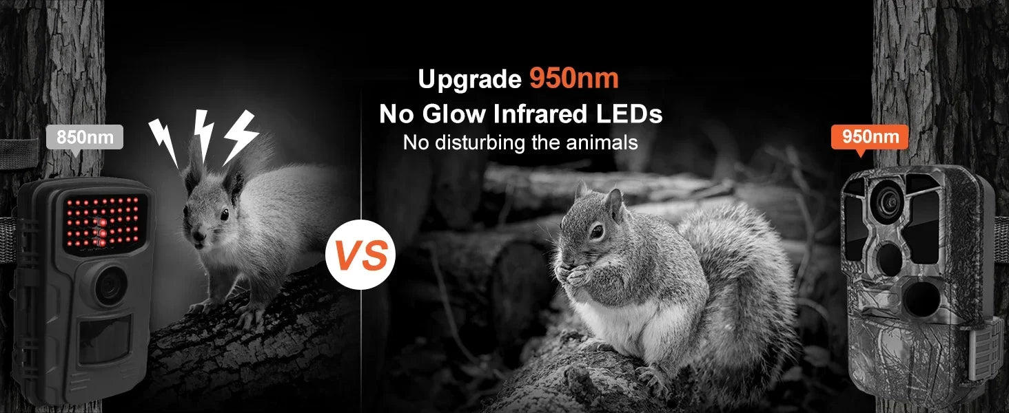 Stealthy Night Vision: Our enhanced 42-piece 950nm No-Glow LED array boasts invisible detection capabilities and incorporates adaptive illumination technology to prevent overexposure or excessive dimming. This ensures the trail cam produces clear night images and videos in complete darkness without causing any disturbance to the surrounding wildlife.