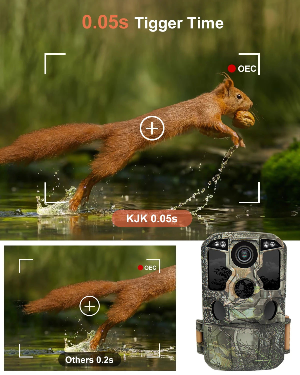 0.05s Trigger Time &130°Wide Angle: Coupled with a lightning-fast 0.05-second trigger speed and a selectable 1-5 Photos Per Trigger, the LCK228 trail camera ensures you'll never miss the action, combined with 130° Wide Angle PIR Detection and a 100ft detection distance to give you an expansive field view. The custom camo pattern blends perfectly into the environment.