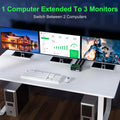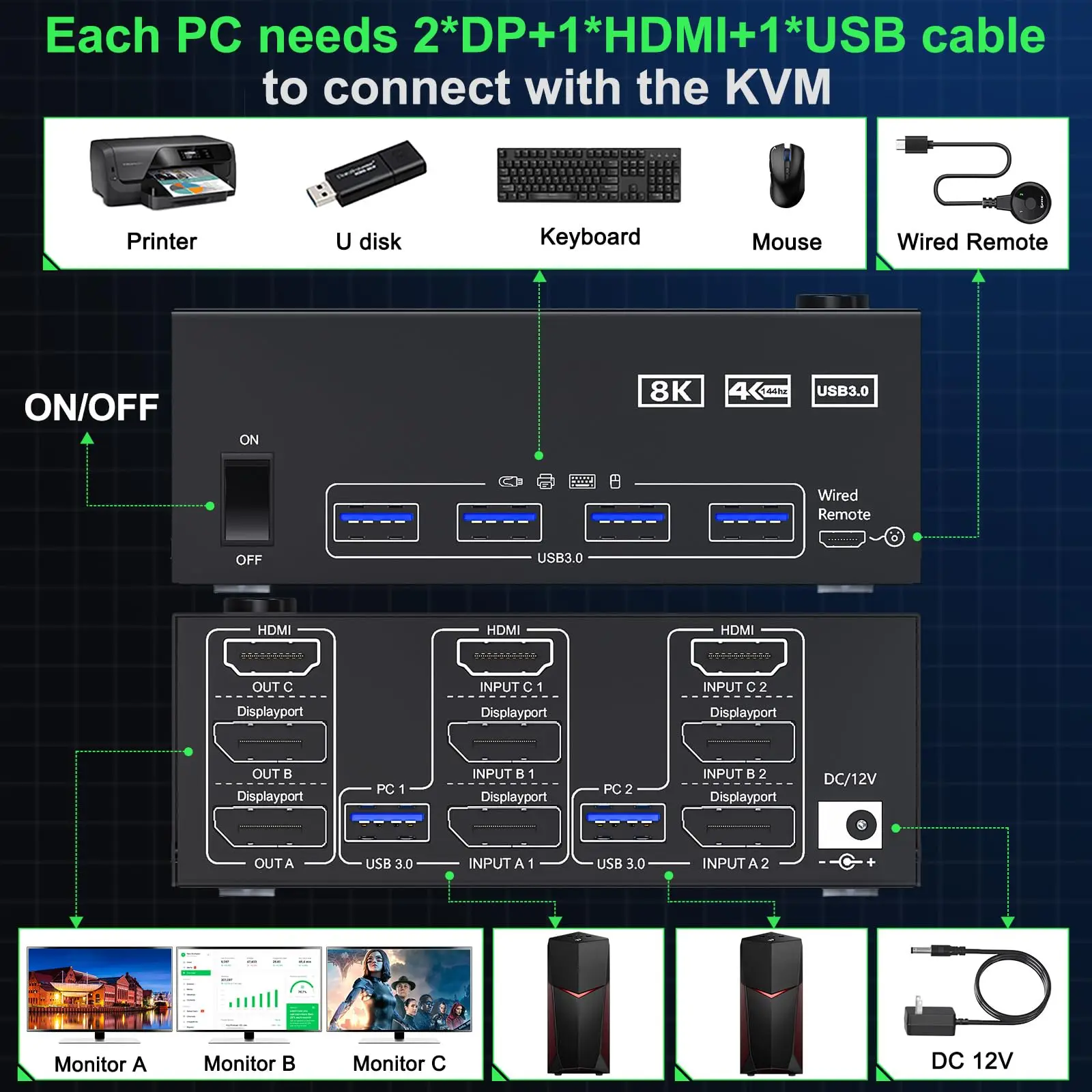 【Important Note & Worry-Free Shopping】(1) Each PC needs 2*DP+1*HDMI+1*USB cable to be connected to get triple screens; (2) Before connecting the triple monitor kvm, please connect your computers to 3 monitors directly to ensure that multi-screen output is supported.