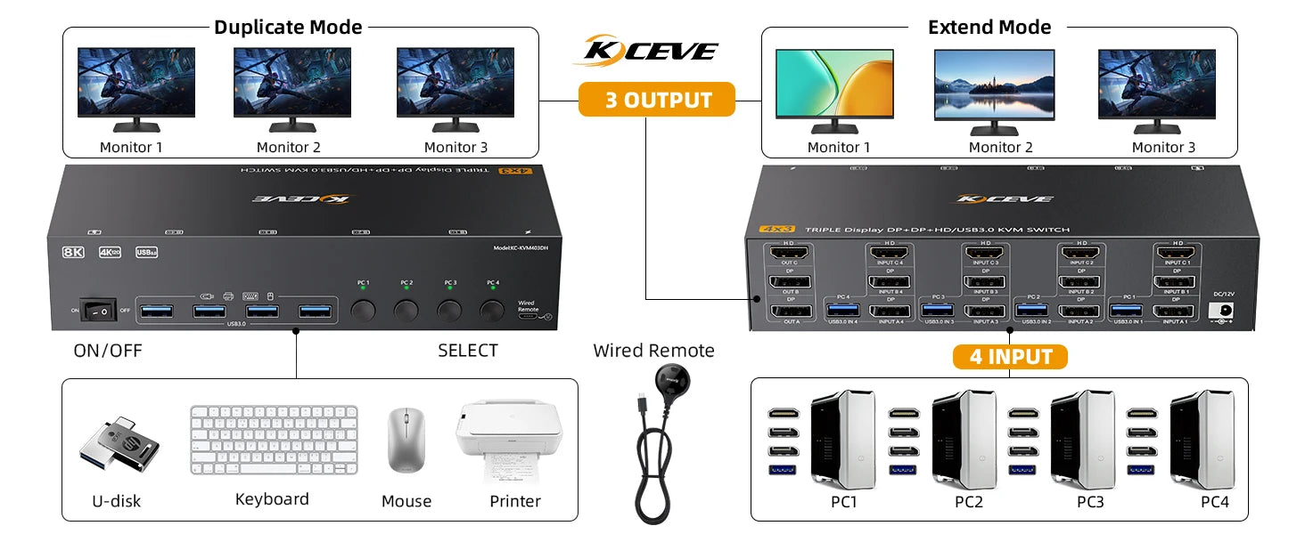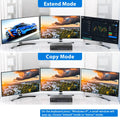 【HDMI + DP 3 Monitors KVM Switch】This is a perfect 3 monitors KVM switch for DP and HDMI ports device to share keyboard mouse and monitor. When in copy mode the main screen can be copied to the second output screen. When in extend mode, the window from the main screen can be dragged to the second output screen.