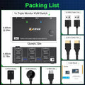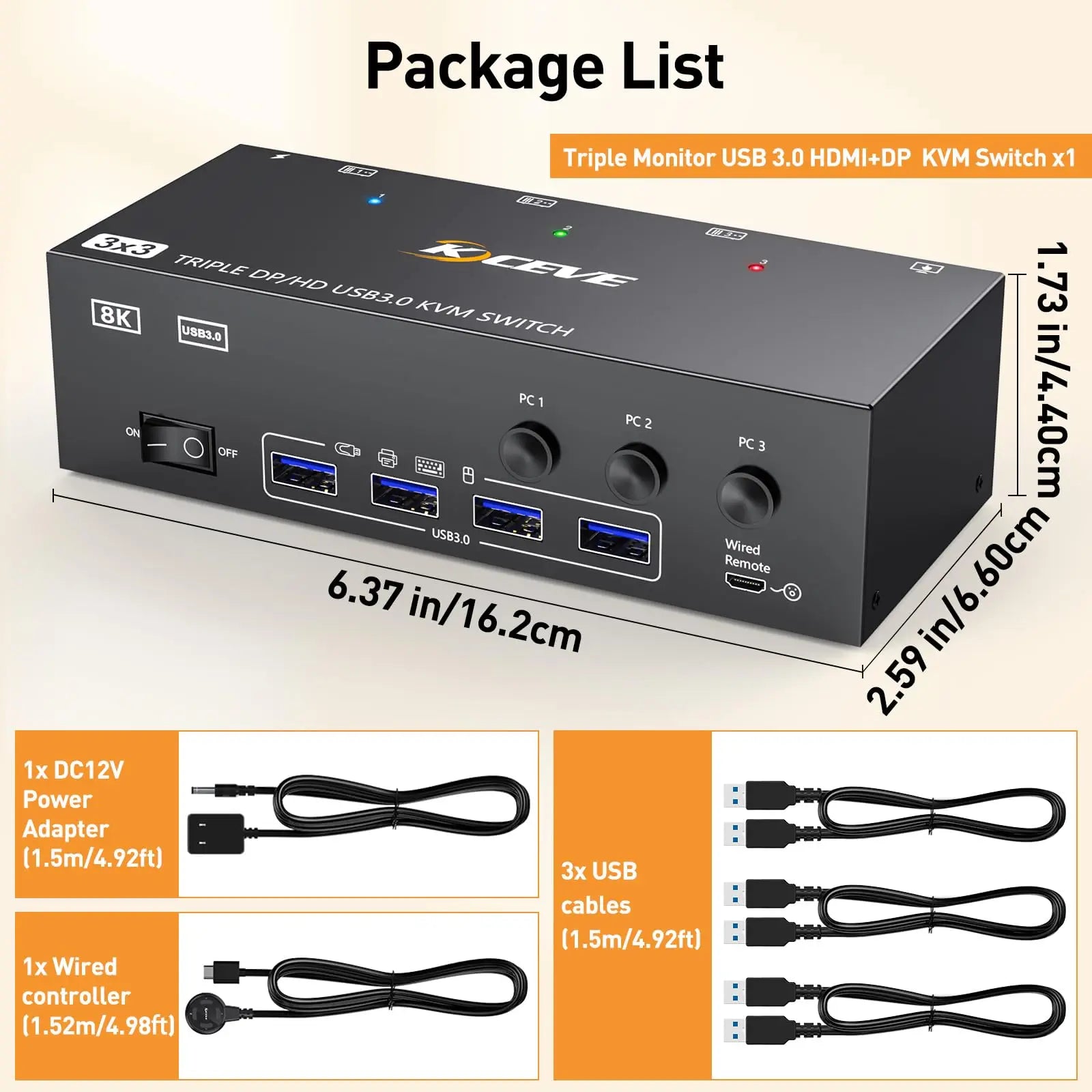 【Package List】1*Triple Monitor USB3.0 KVM Switch+3*USB3.0 Cables(1.5m/4.9ft)+1*Wired remote controller(1.52m/5ft)+1*User manual+1*12V Power Adapter(1.52m/5ft).