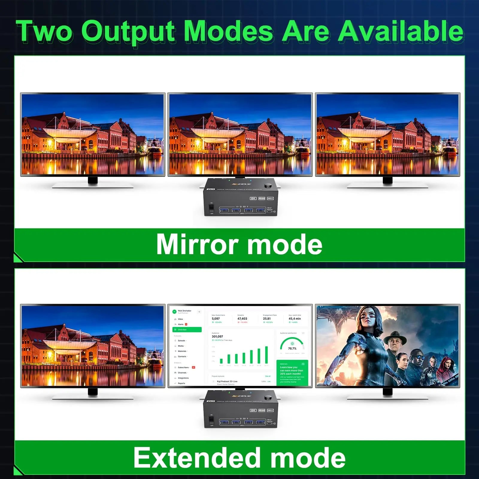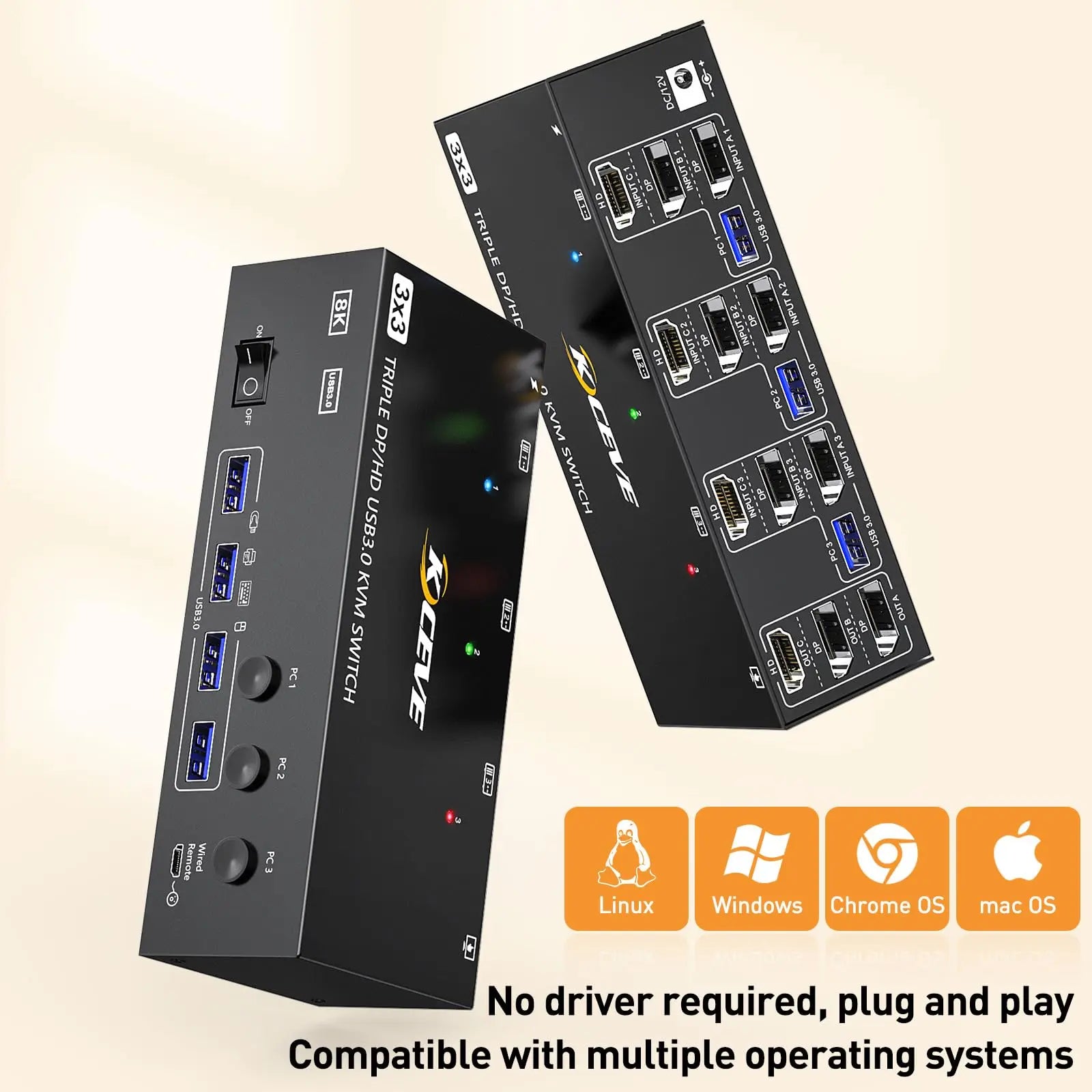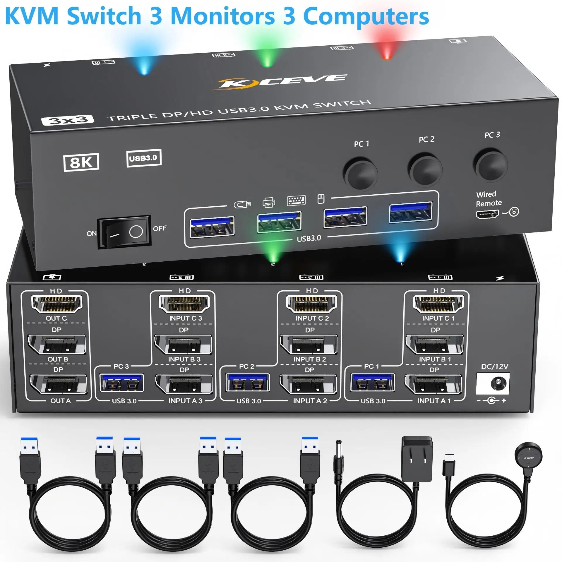 KVM Switch 3 Monitors 2/3/4 Computers,USB 3.0 HDMI+DisplayPort 8K@60Hz/4k@144Hz Triple Monitor Switch for 2 PC Share 4 USB 3.0
