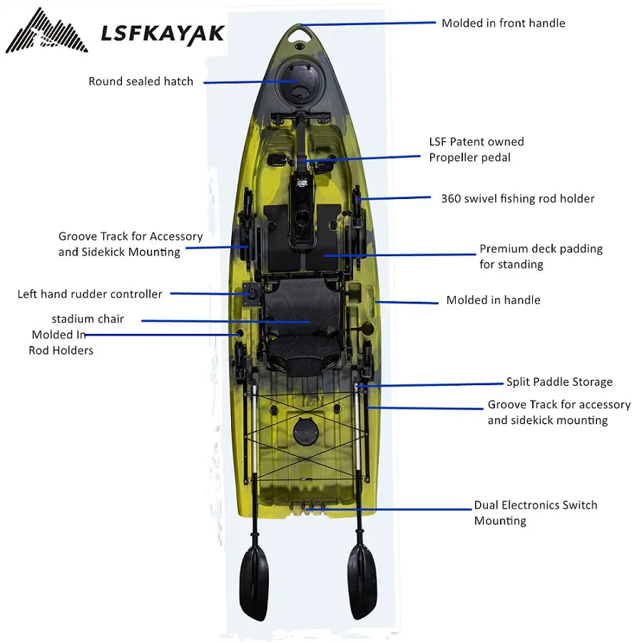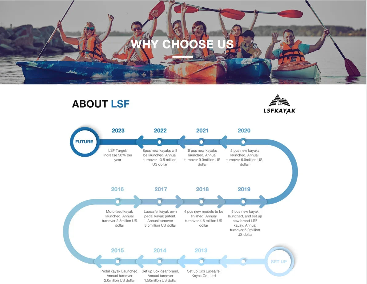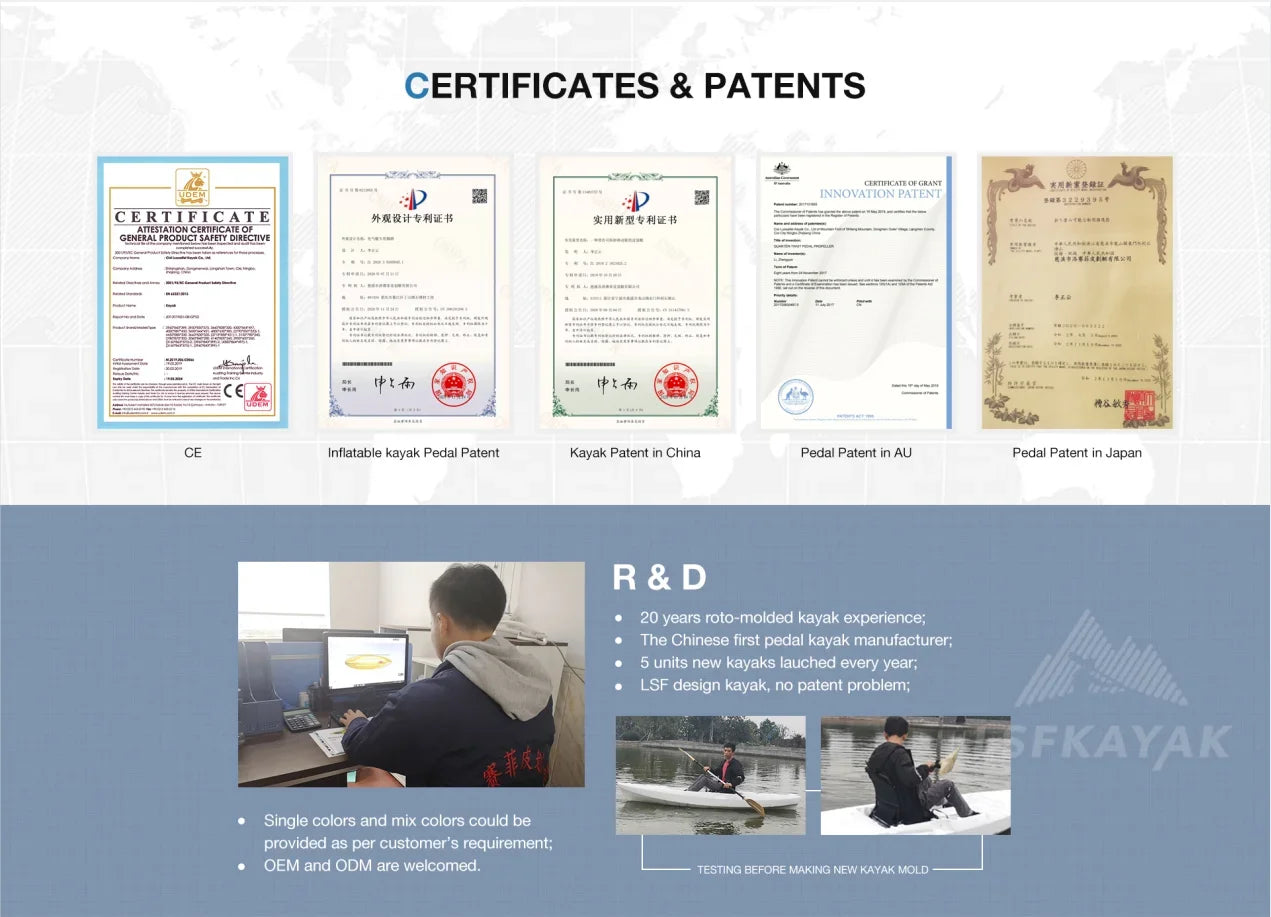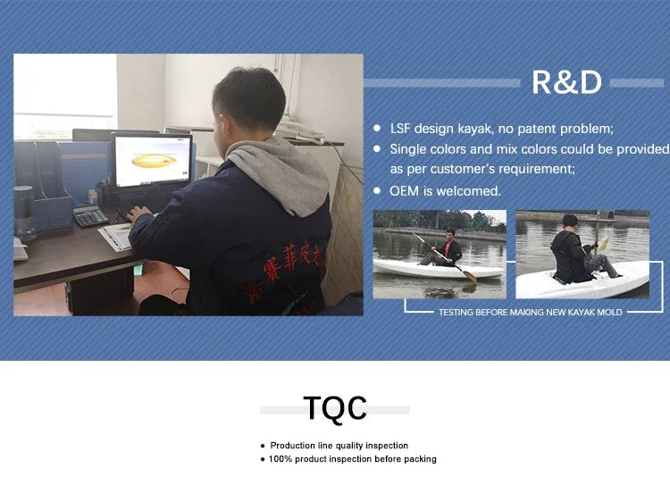--Design: Innovation brings outstanding design. Canoe, fishing kayak, sit in kayak, pedal kayak, etc. The newborn design by LSF Kayak will be witnessed annually.