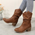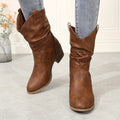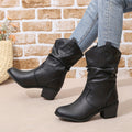 Mid Calf Women's Slouch Boots, Solid Color V-cut Slip On Cowgirl Low Heel Block Stacked Heels