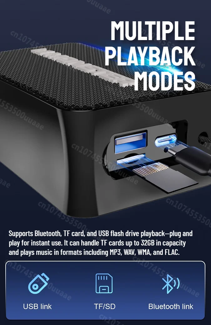 Supports Bluetooth, TF card, and USB flash drive playback—plug and play for instant use. It can handle TF cards up to 32GB in capacity and plays music in formats including MP3, WAV, WMA, and FLAC, meeting diverse audio needs effortlessly.