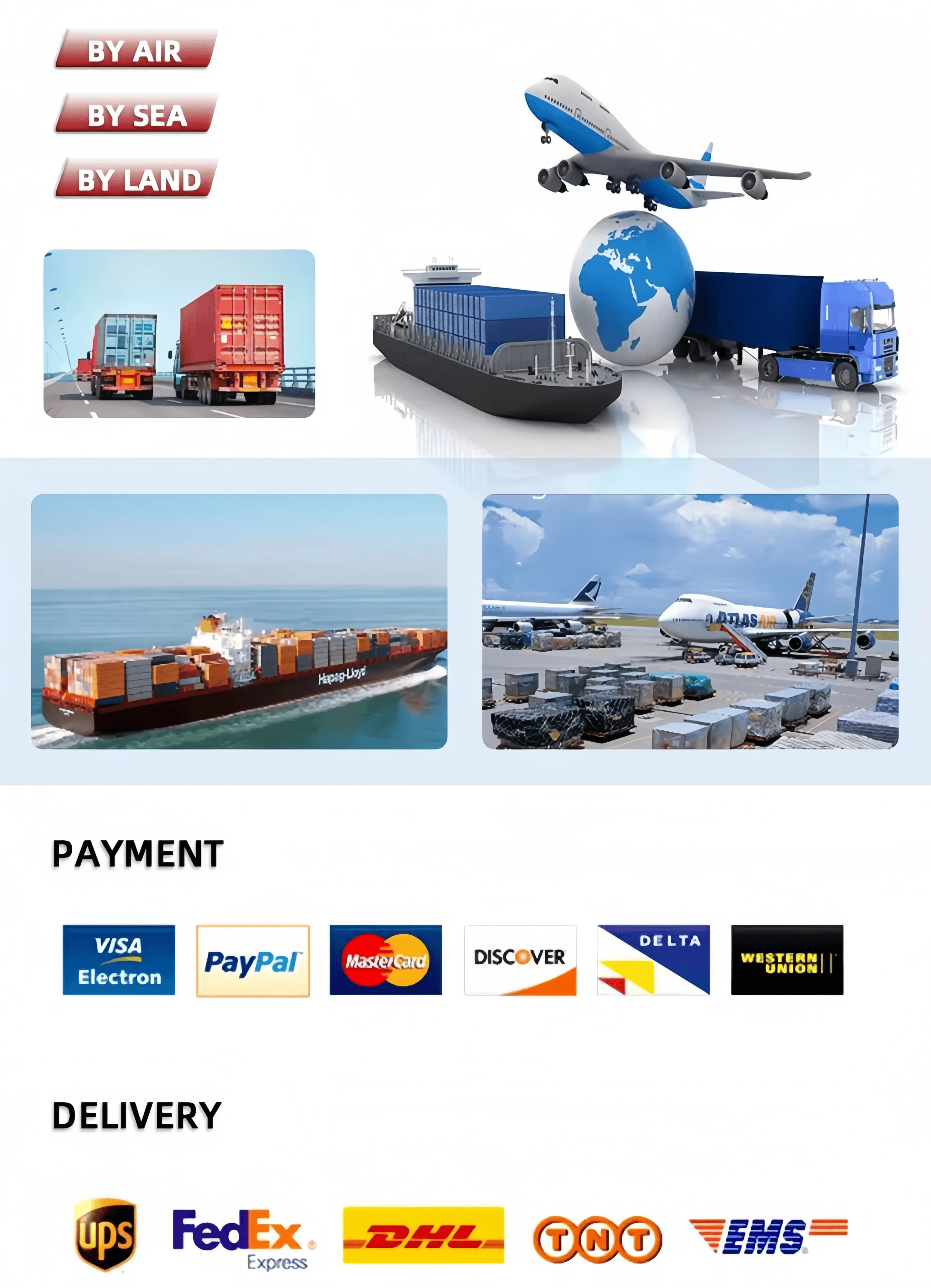 For Payment Terms, we accept T/T(30% deposit. 70% before shipment), Credit Card, Trade Assurance or RMB payment. For Trade Terms, we accept EXW, FOB, CiF etc. You can choose the one which is the most convenient and cost effeclive for you. |