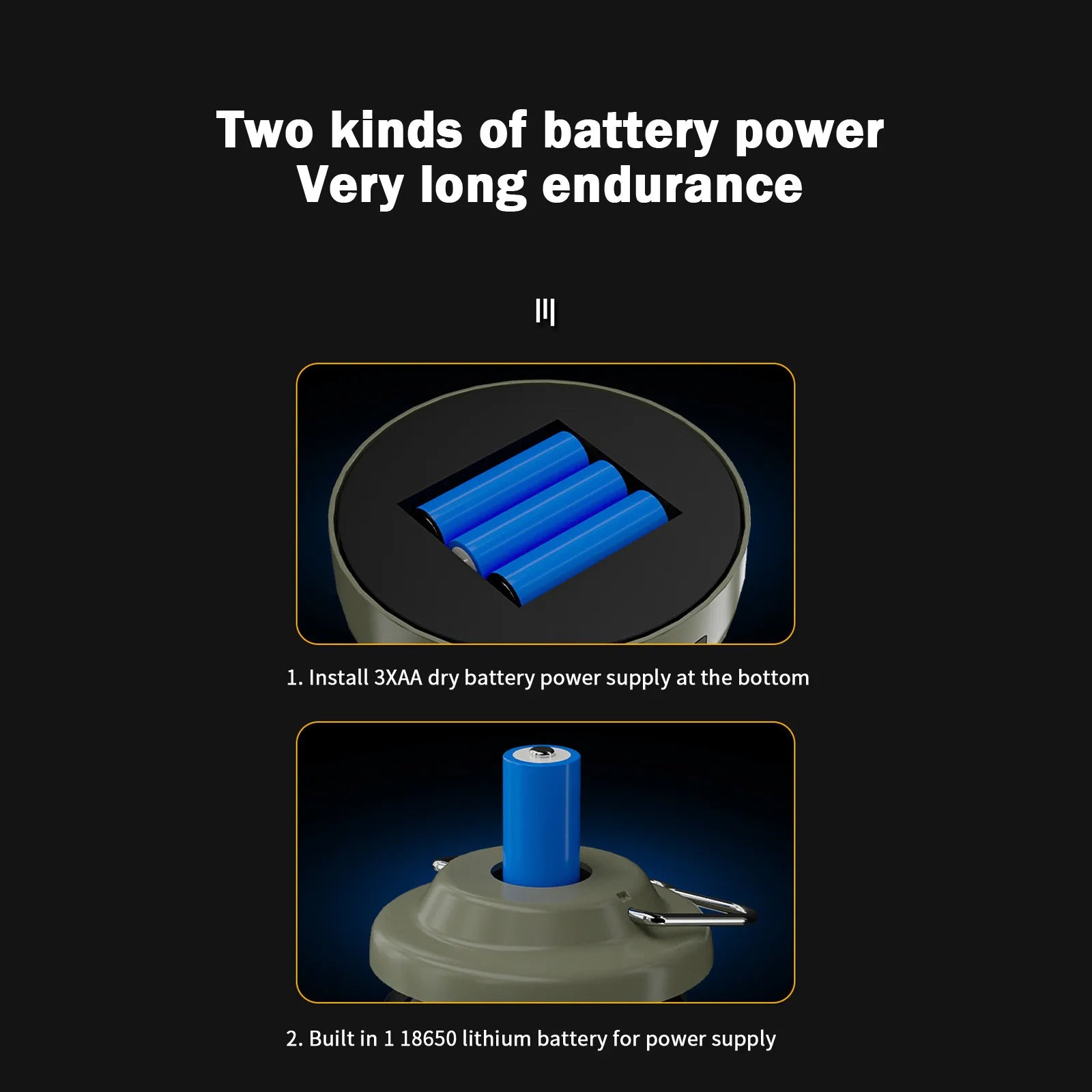 RECHARGEABLE LIGHT: Our camping is designed with a rechargeable system for energy saving use and also has a backup battery compartment powered by 3 x AA batteries (not included) for emergencies.