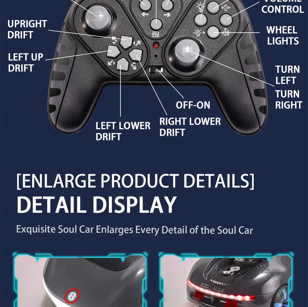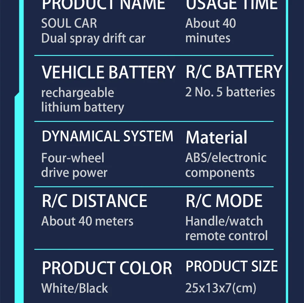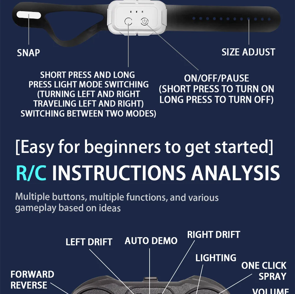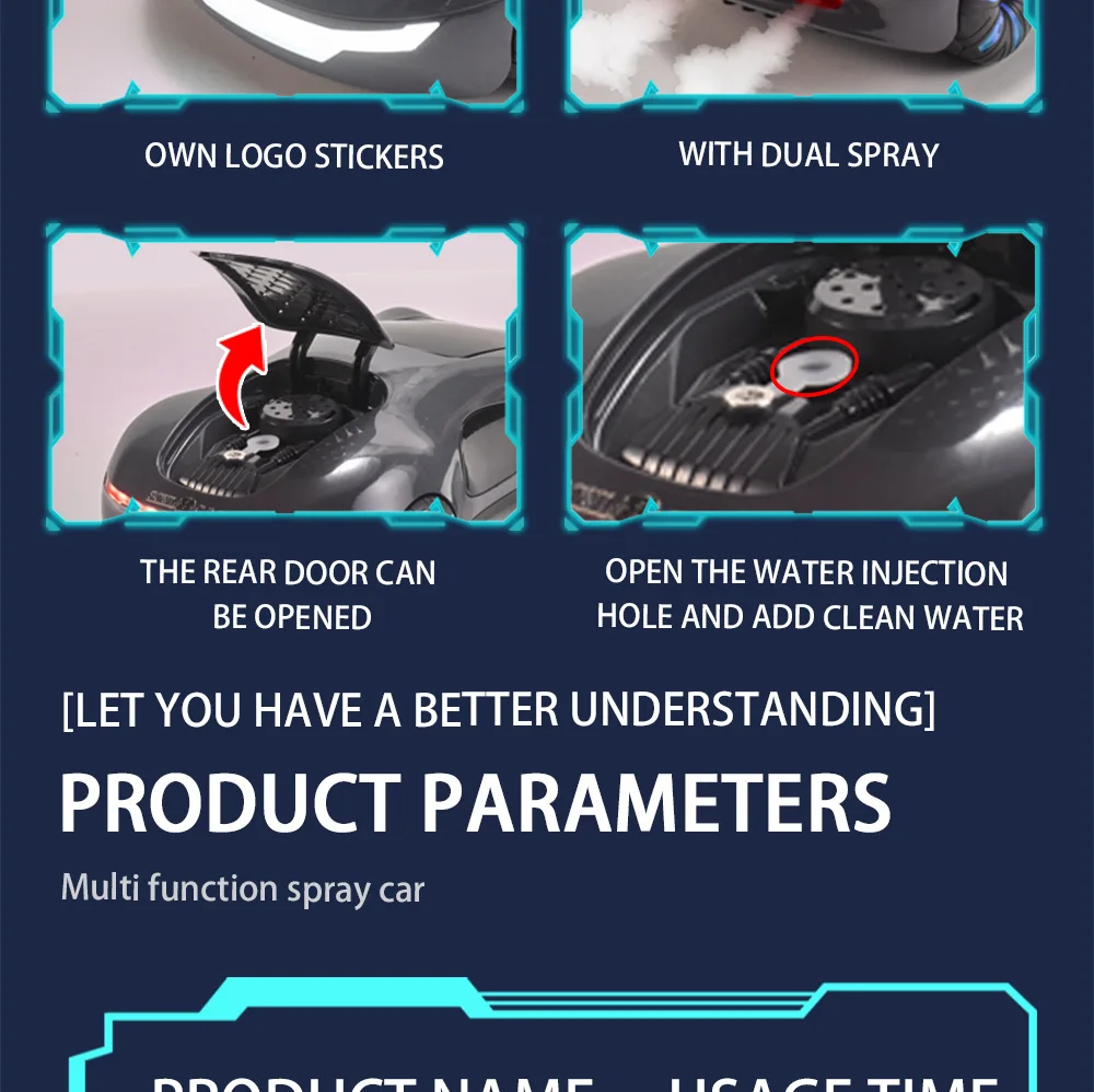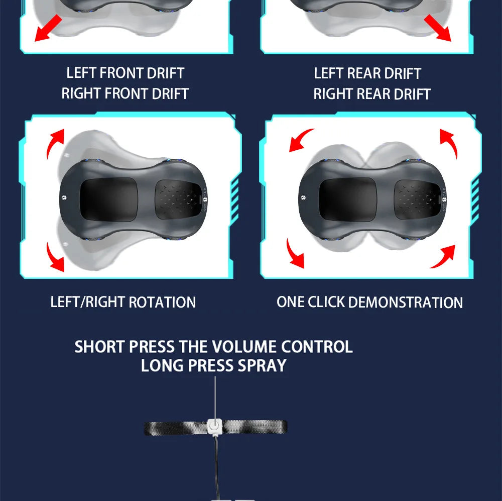 Forward, Backward, Left and Right turns,One-click Spray, Lighting