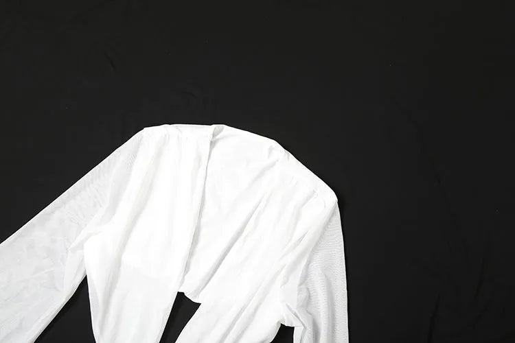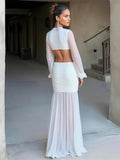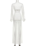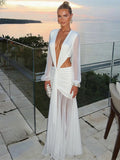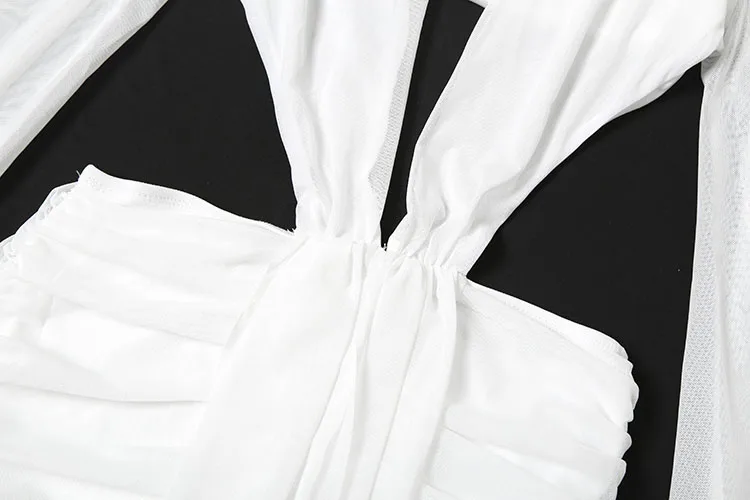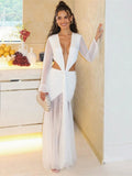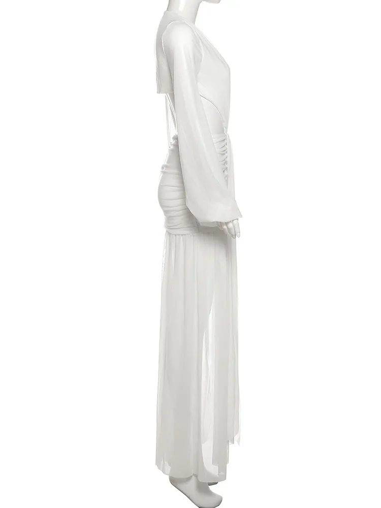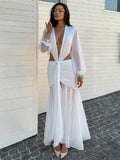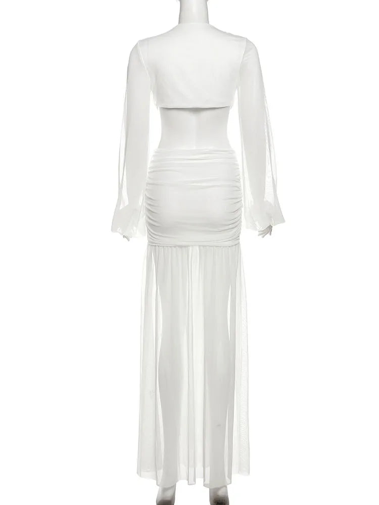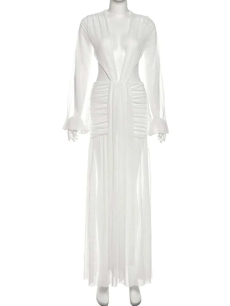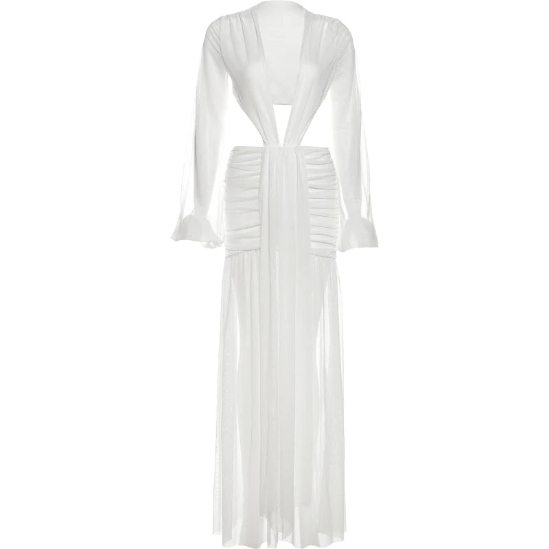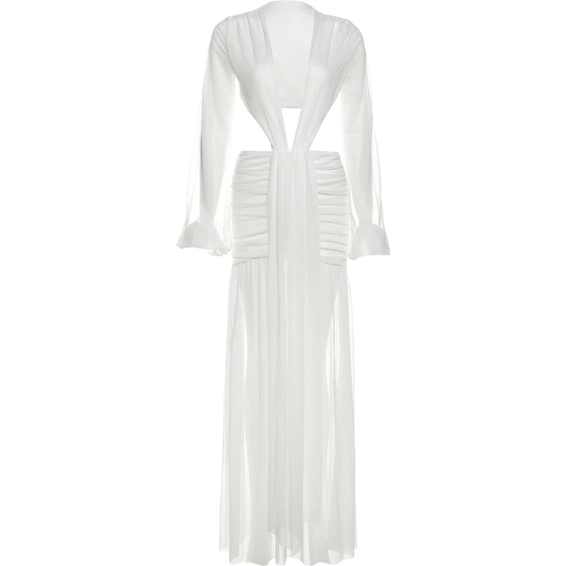 Nibber Sexy Dress Women See Through Deep V-Neck Full Sleeve Hollow Waistless Ruched Knot Ribbon High Street Elegant Long Bodycon