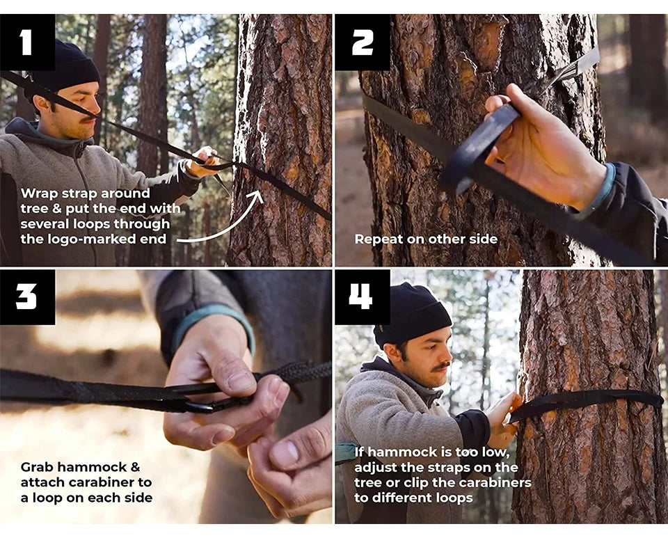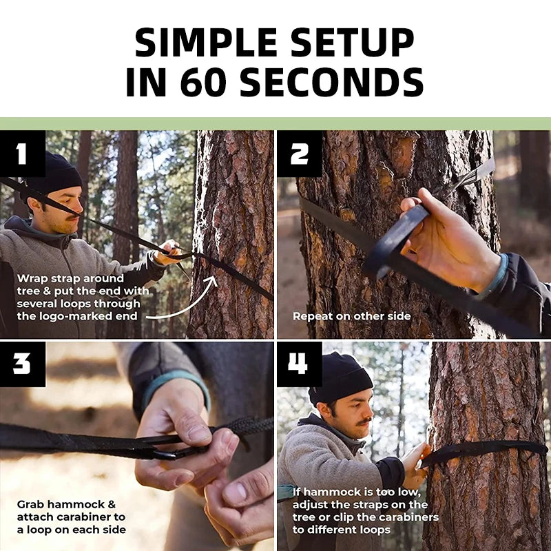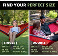Easy Setup: Equipped with two 9ft long tree straps and carabiners, our hammocks for camping makes setting up a breeze. It also features 5 separate loops, so you can adjust it to the perfect height. Single hammock holds up to 400 lbs, while the Double Hammock holds up to 500 lbs