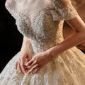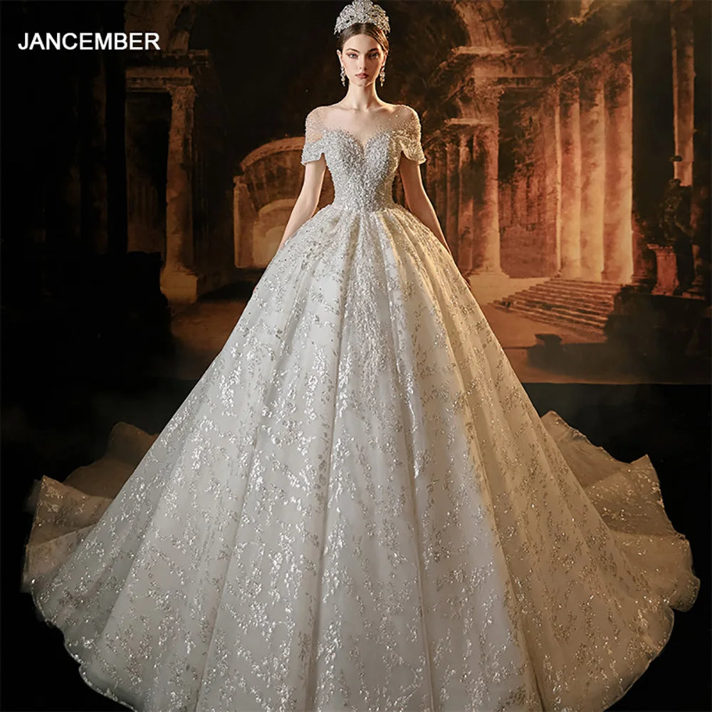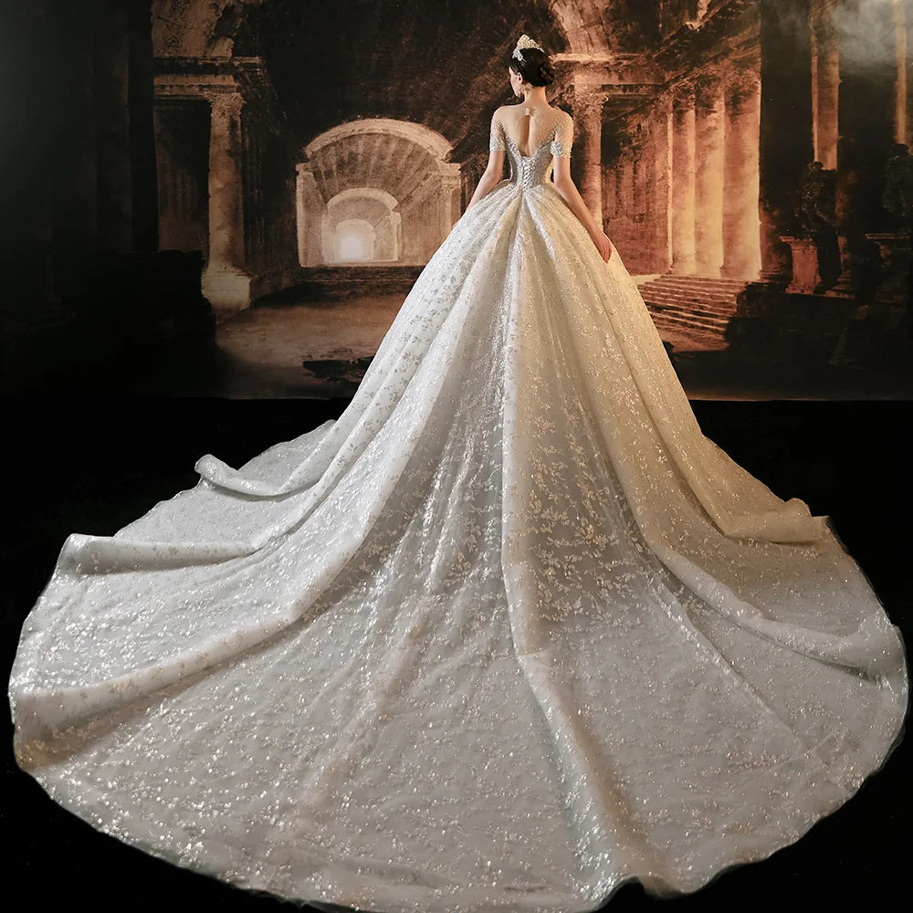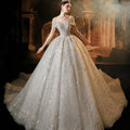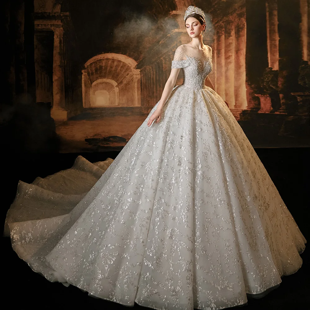 Palace Off the Shoulder Wedding Dresses Sequins Diamond Sequins Applique Boat Neck Ivory Woman Celebrity Bride Gowns LSMX010