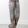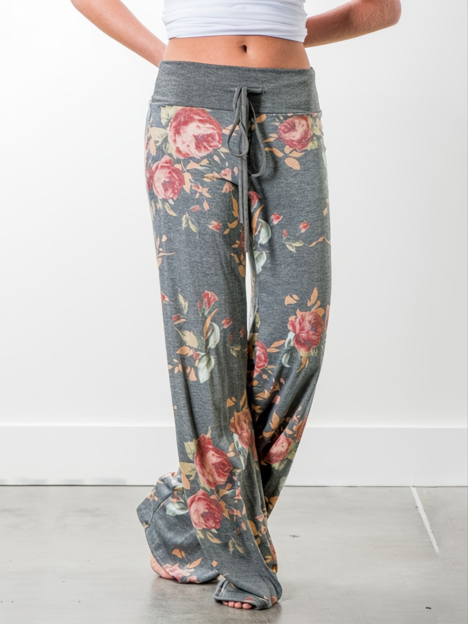 Plus Size Floral Print High Rise Drawstring Long Pants, Women's Plus Slight Stretch Loose Casual Pants