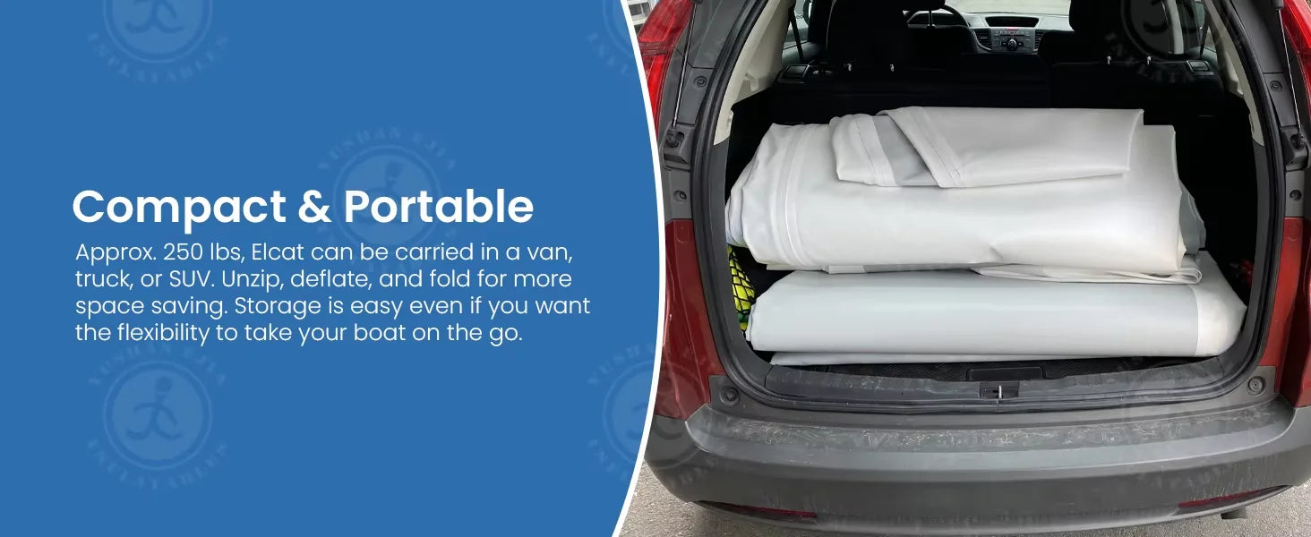 1. Compact & Portable: Weighing approximately 250 lbs, Elcat is highly portable and fits into vans, trucks, or SUVs. Quick deflation, folding, and storage ensure you can take your boat on the go without hassle.