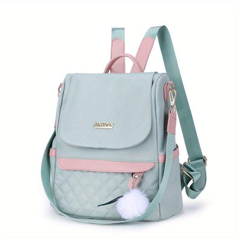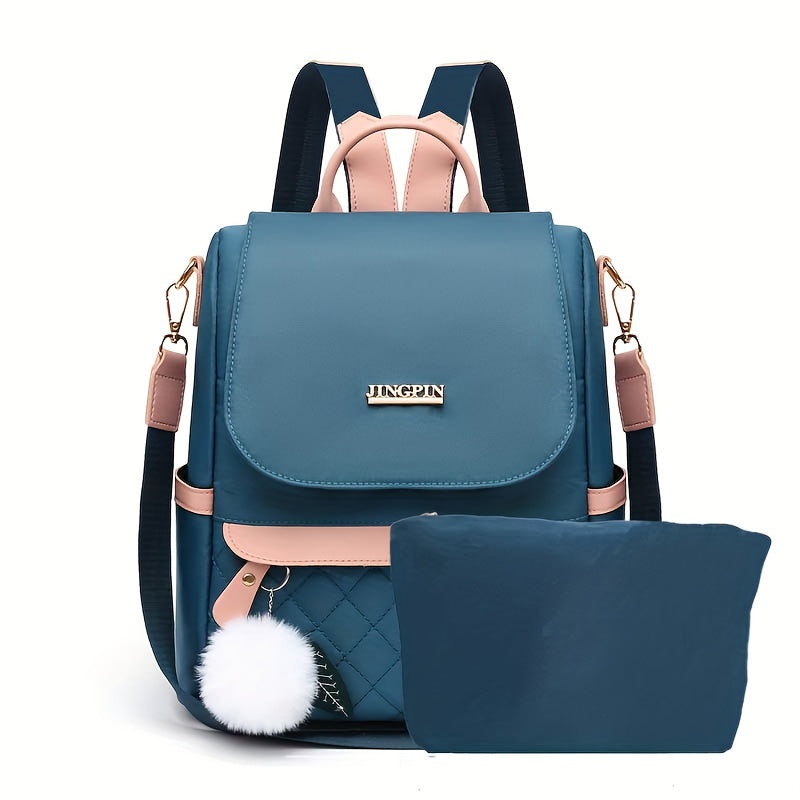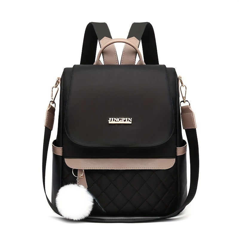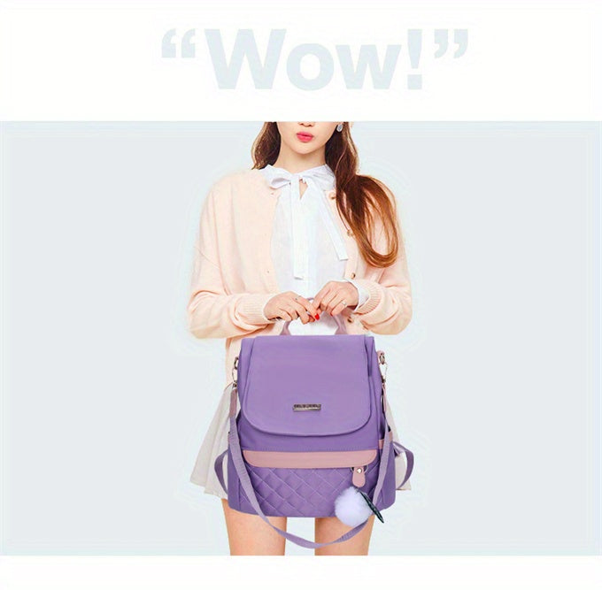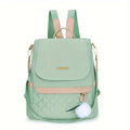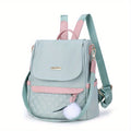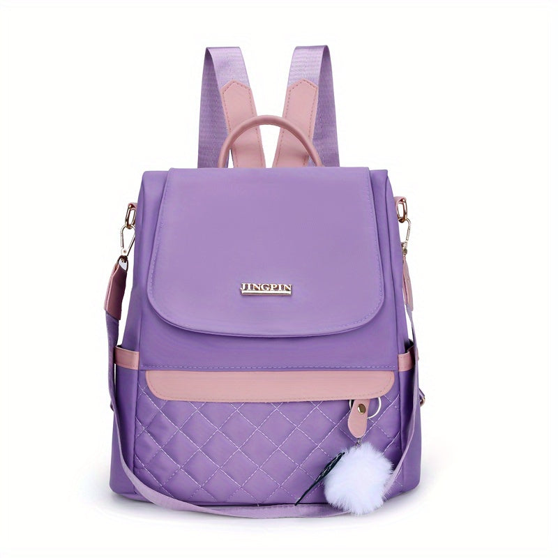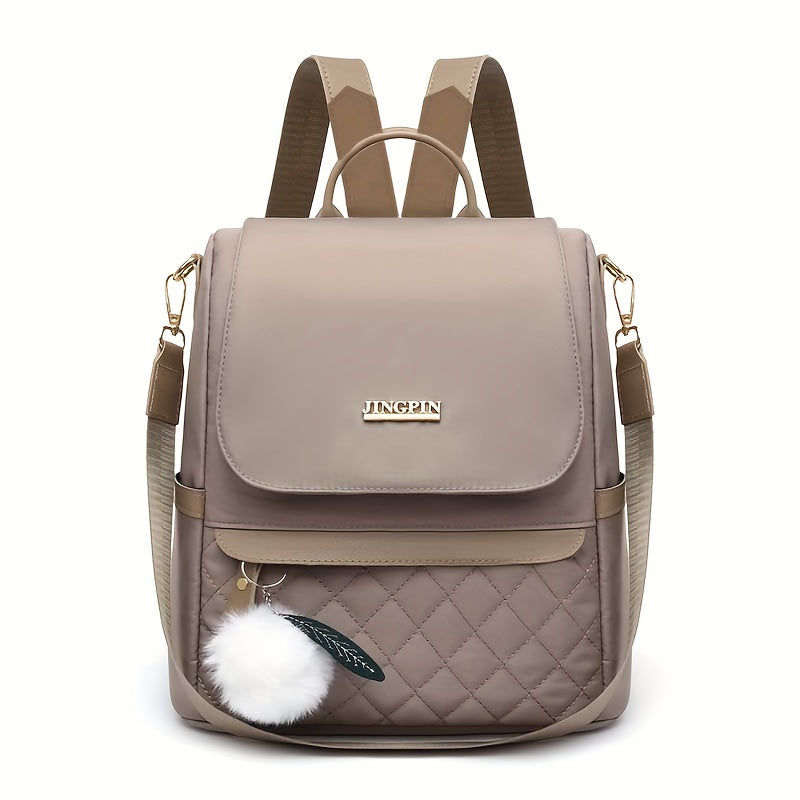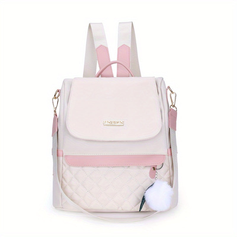 Quilted Flap Backpack Purse, Women's Nylon Travel Shoulder Bag, Casual Pompom Decor Bookbag