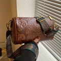 Retro Flower Embossed Cylinder Bag, Classic Textured Zipper Crossbody Purse, With Wide Geometric Pattern Strap Barrel Bag