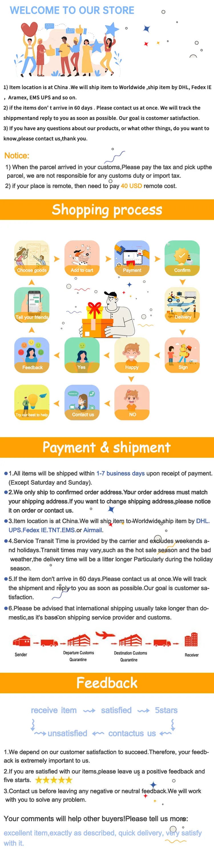 2.When the parcel arrives at your local customs, please pay the tax and take the parcel away. We do not bear any customs duties or import taxes. If the customs fails due to the buyer's reasons and the goods are returned or destroyed, we will not refund any money.