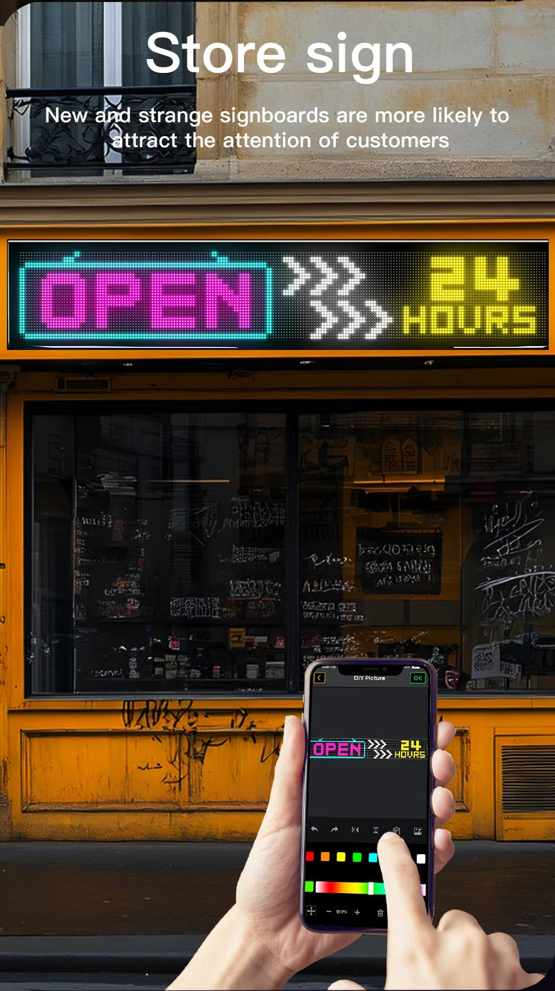 This application has many interesting modes and animations built-in. By connecting the LED matrix through the app, you can DIY design text, patterns, and animations according to your needs and scenes. You can also adjust brightness and speed, change display content according to usage scenarios, and edit exclusive patterns and animations based on the characteristics of your store. DIY allows you to customize interesting patterns and texts to make your display content more unique and perfectly meet your needs.