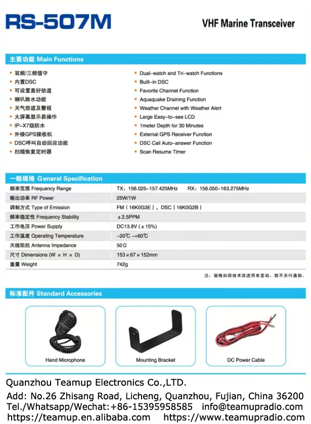 RS-507M 25W VHF GPS Receiver IPX7 Waterproof Mobile Boat Marine Radio DSC Call Auto 50km Range RS507M Wireless Walkie Talkie