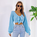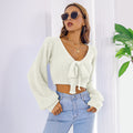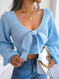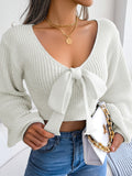 Sexy Bowknot V Neck Crop Sweater, Casual Lantern Long Sleeve Loose Fall Winter Knit Sweater, Women's Clothing
