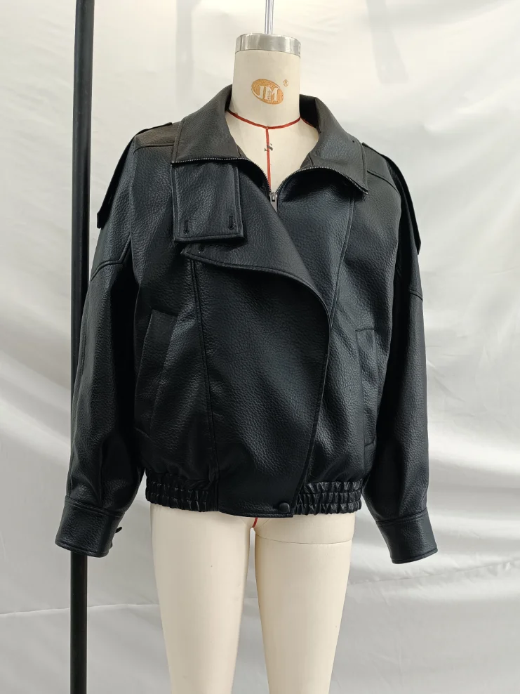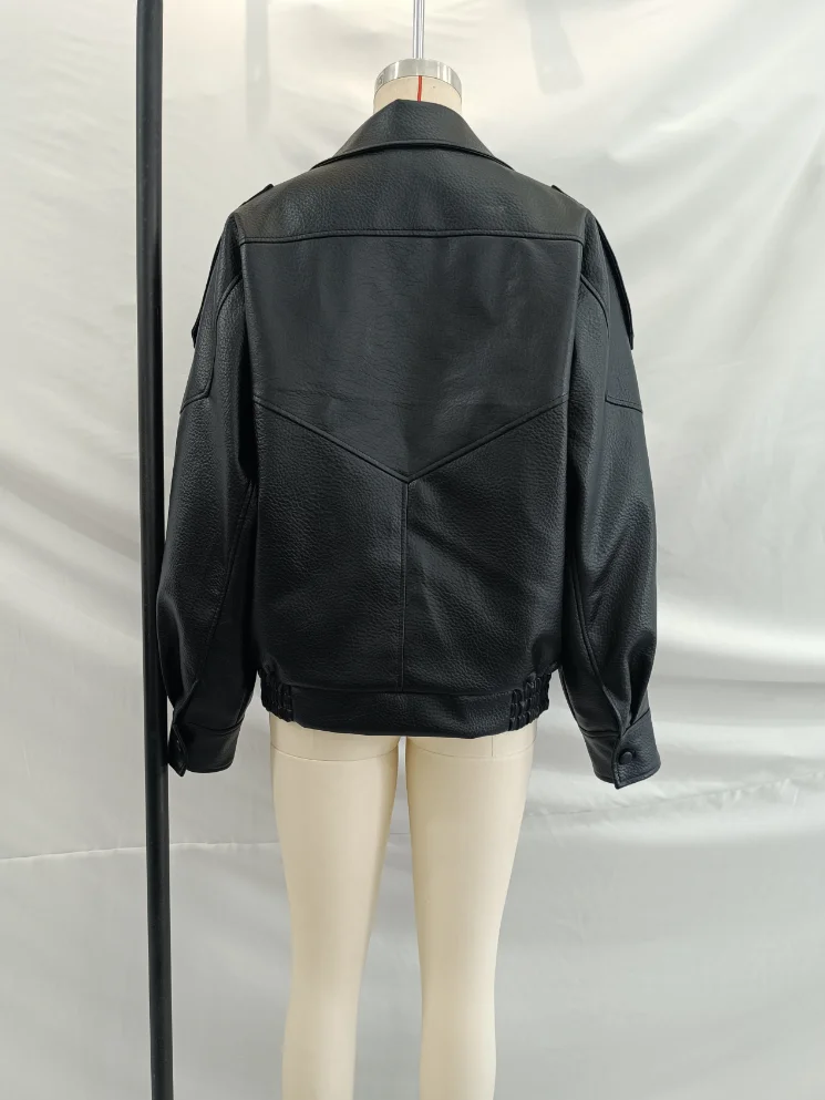 Slant Opening Faux Leather Jacket Women Vintage Stand Collar Epaulet Long Sleeve Pocket Coats New Early Autumn Ladies Outerwears