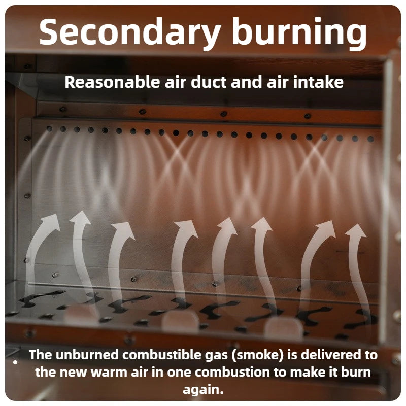 Secondary combustion is placed on the bottom of the secondary combustion side panel, and the new warm air is sent to the combustible gas (smoke) that was not burned out due to the primary combustion and re-burns for improved combustion efficiency, smoke, and high flame power