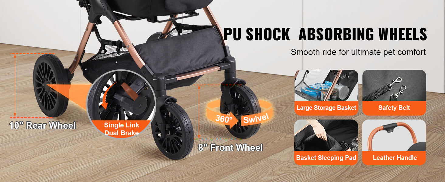 Flexible Large Wheels: This dog stroller has wear-resistant and shock-absorbing PU large wheels (8" front, 10" rear), ensuring a comfortable ride for your pet on any path. The 360° swivel front wheels provide easy maneuvering, and the rear wheels' dual-brake system provides safety for you and your pet. Just a gentle step on the brakes, and both wheels lock. The adjustable handle height provides convenience for every trip.