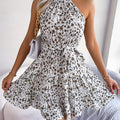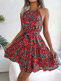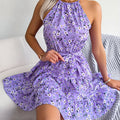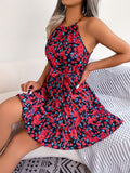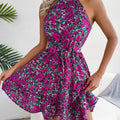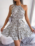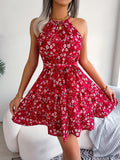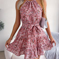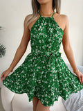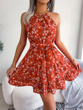 [Summer Floral Belted Beach Dress] Floral Print Belted Beach Dress, Sleeveless Casual Vacation Dress For Summer & Spring, Women's Clothing