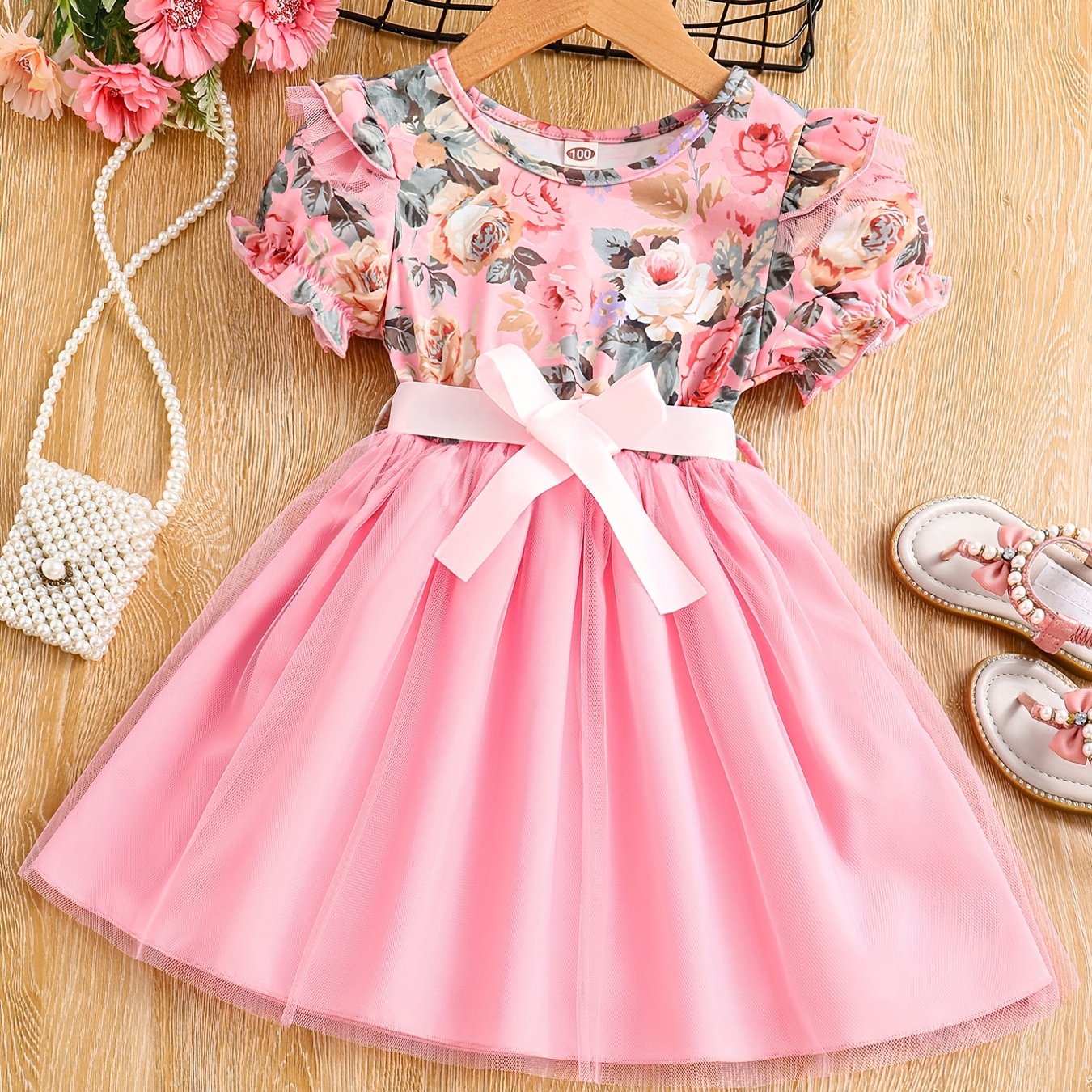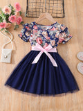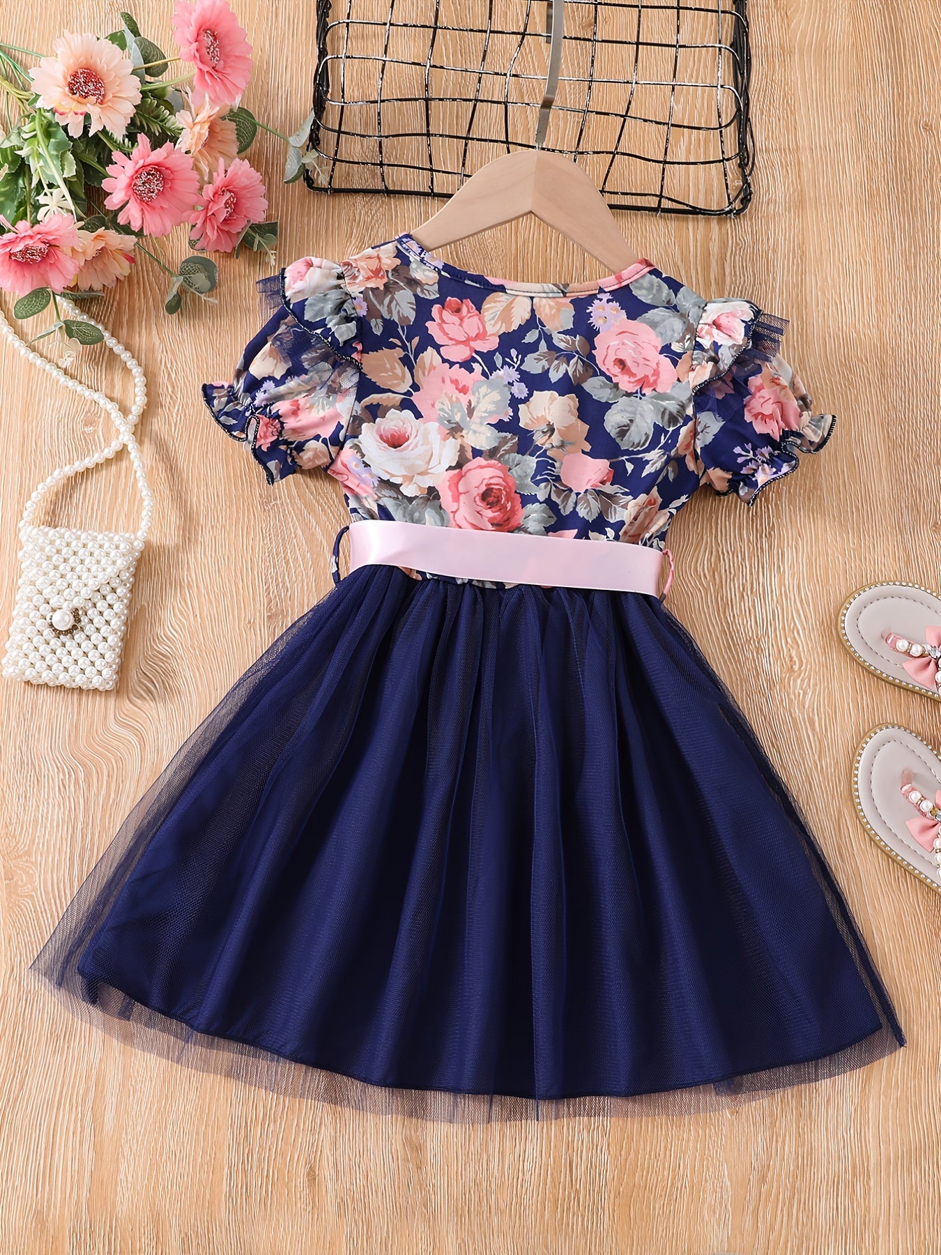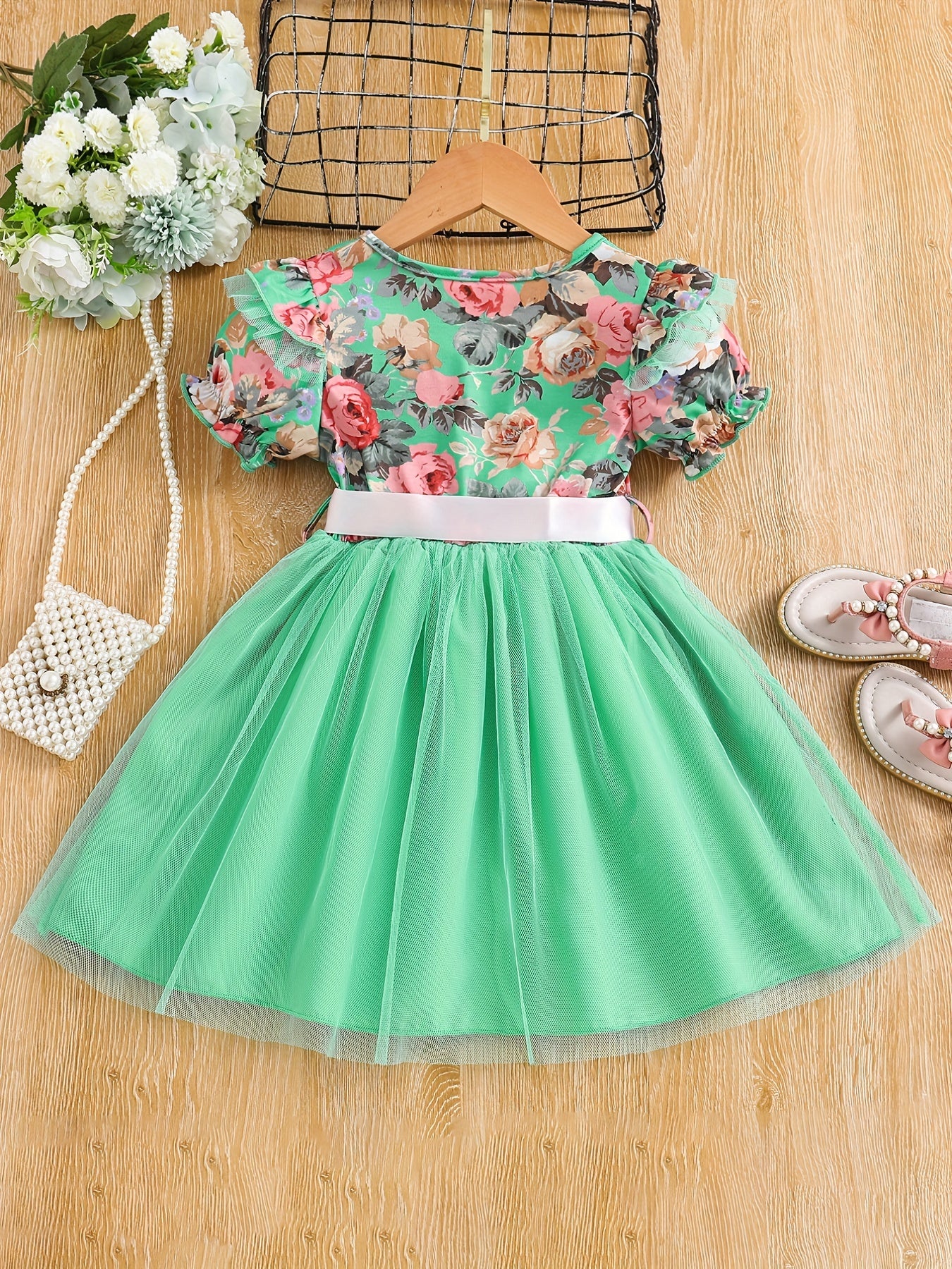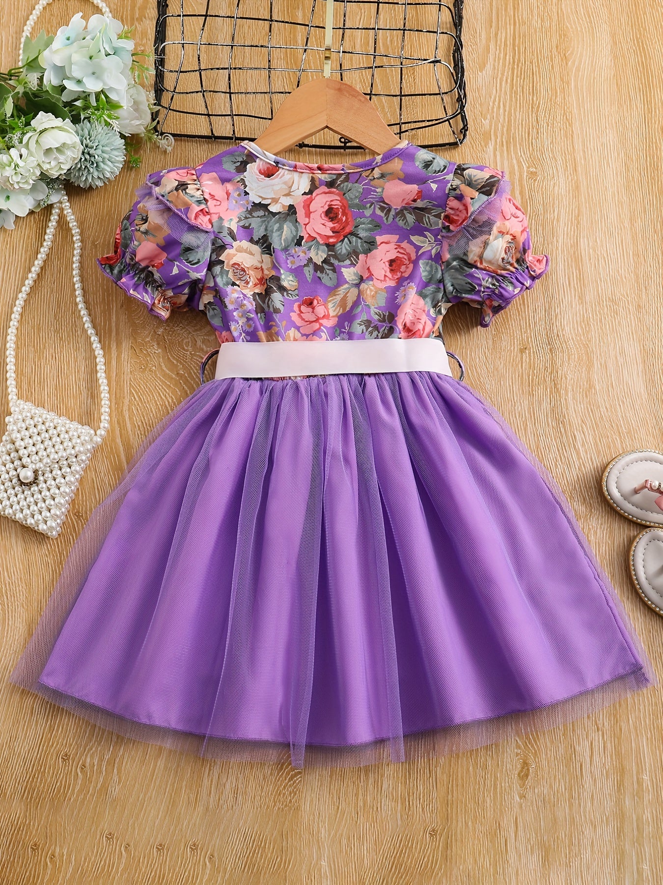 Toddler Girls Puff Sleeve Ruffle Trim Floral Graphic Mesh Belted Princess Dress For Party Kids Summer Clothes