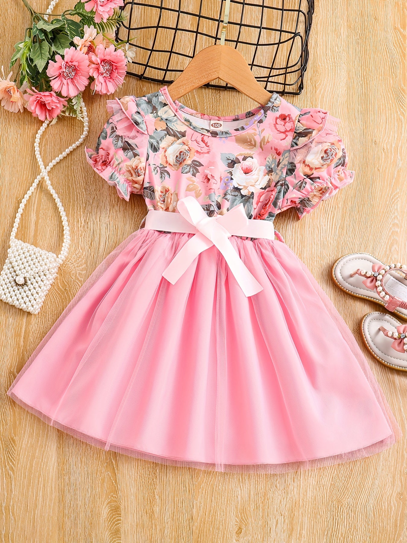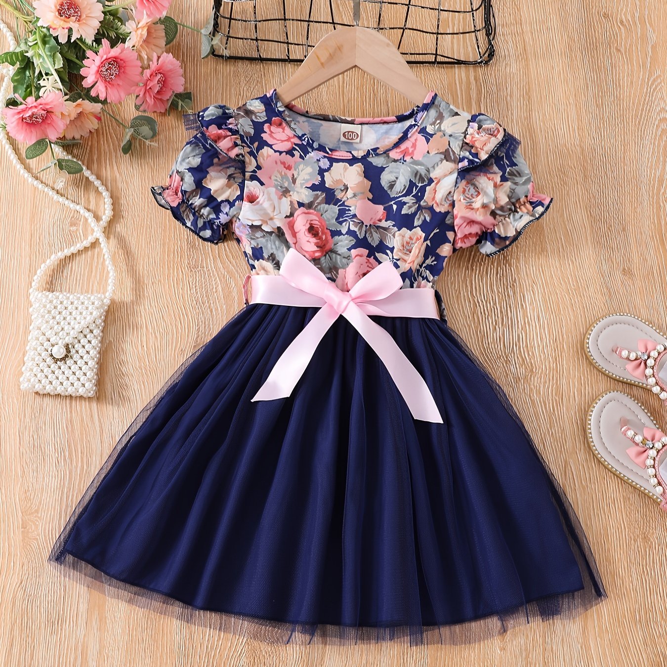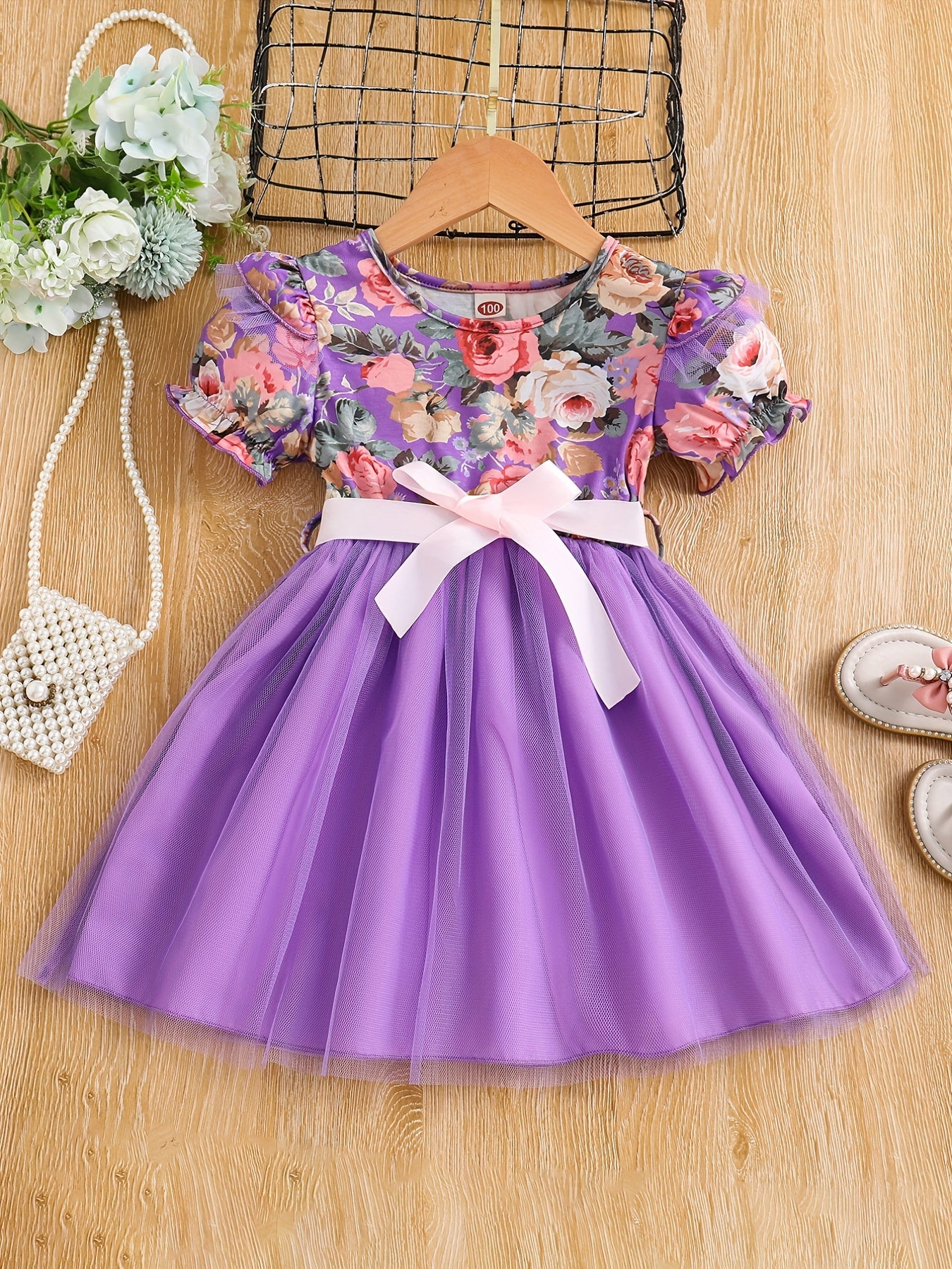 Toddler Girls Puff Sleeve Ruffle Trim Floral Graphic Mesh Belted Princess Dress For Party Kids Summer Clothes