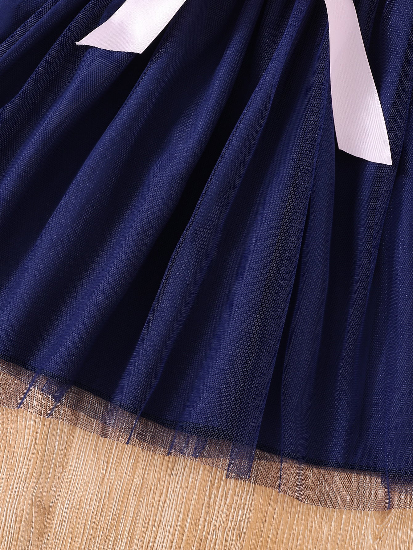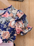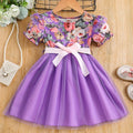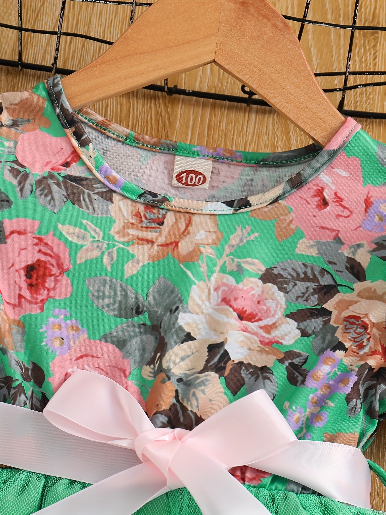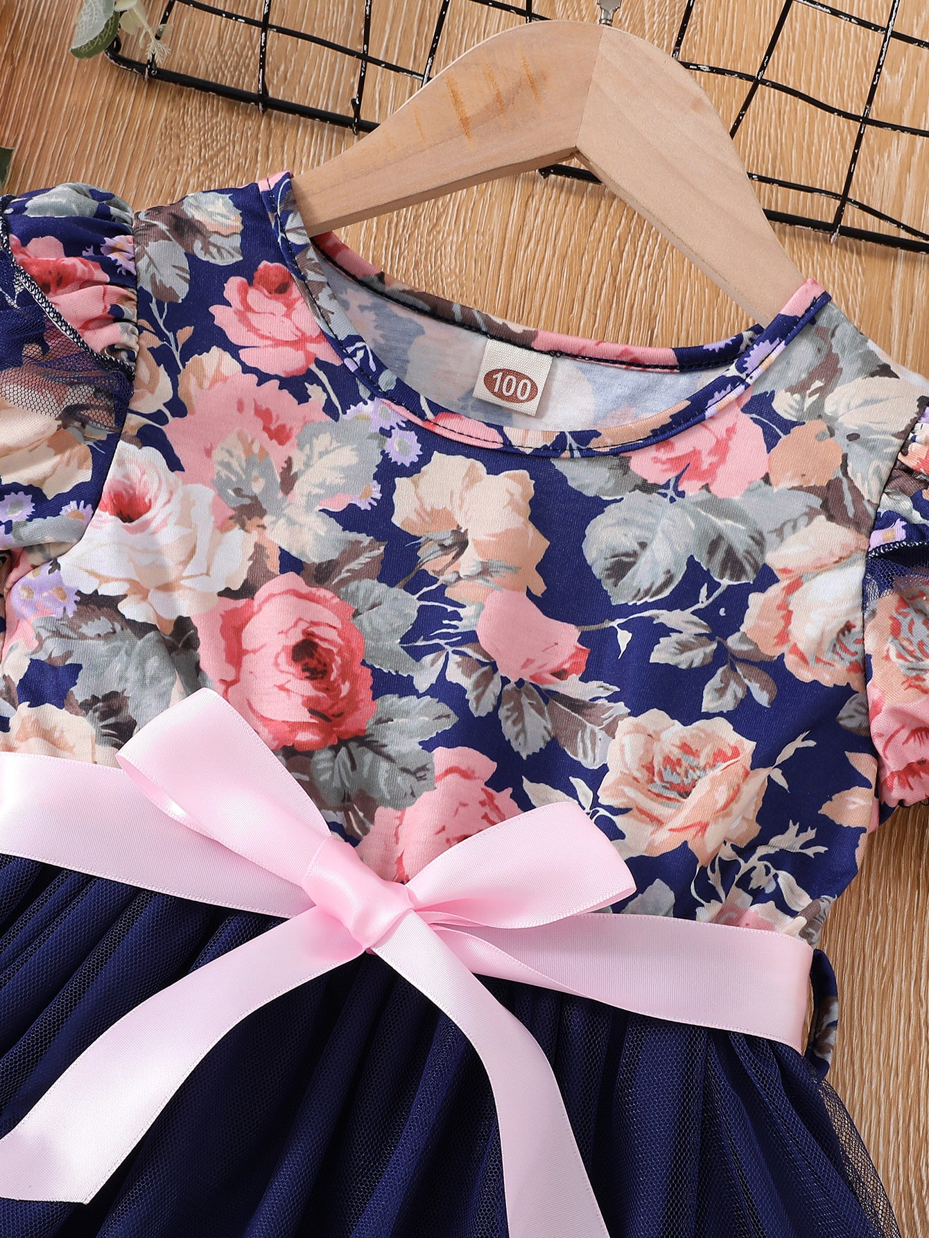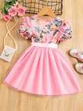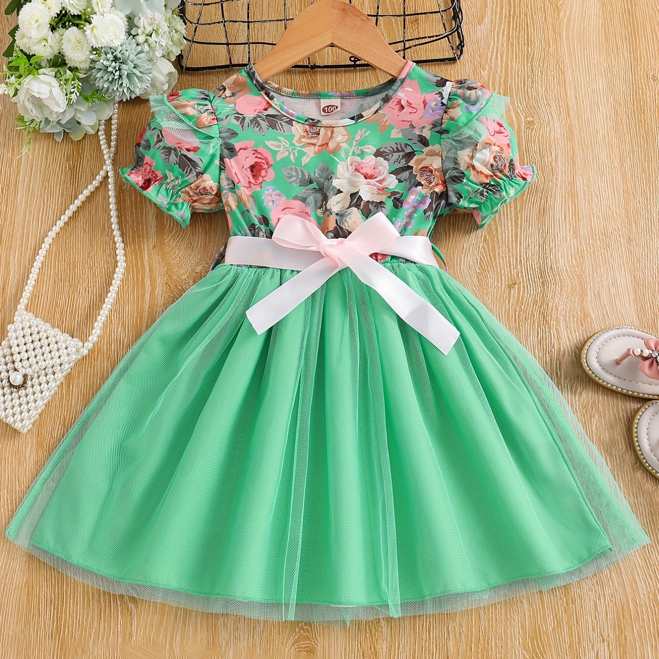 Toddler Girls Puff Sleeve Ruffle Trim Floral Graphic Mesh Belted Princess Dress For Party Kids Summer Clothes