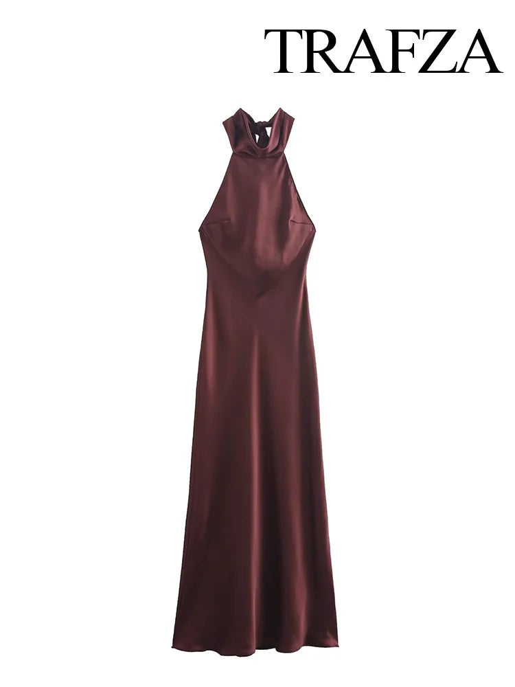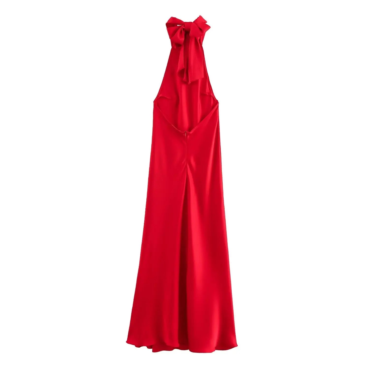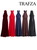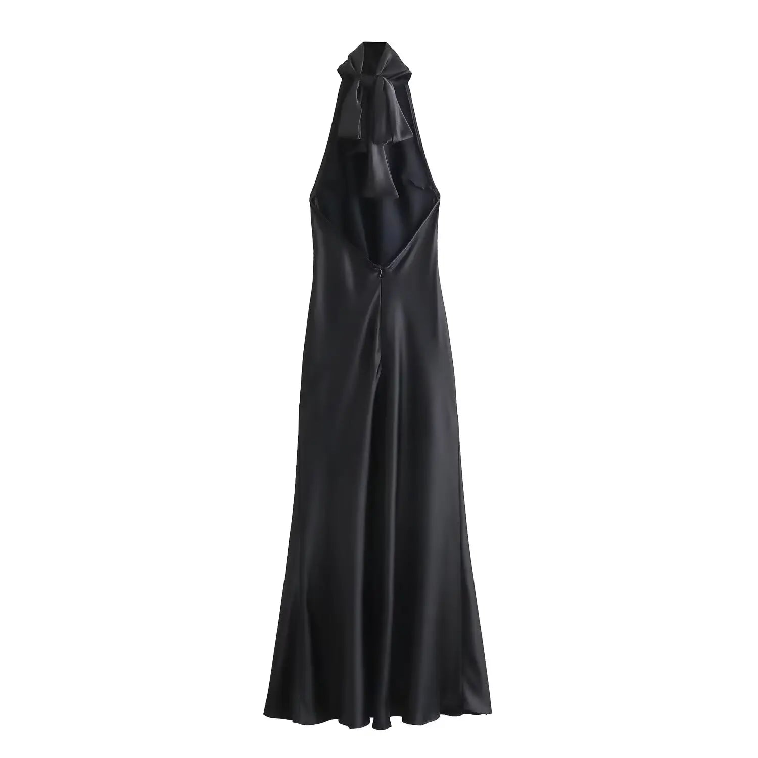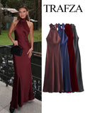 TRAFZA Women Fashion Dress Solid Sleeveless Backless Bow Decoration Zipper Female Summer Elegant Slim Long Dresses 2 Color