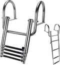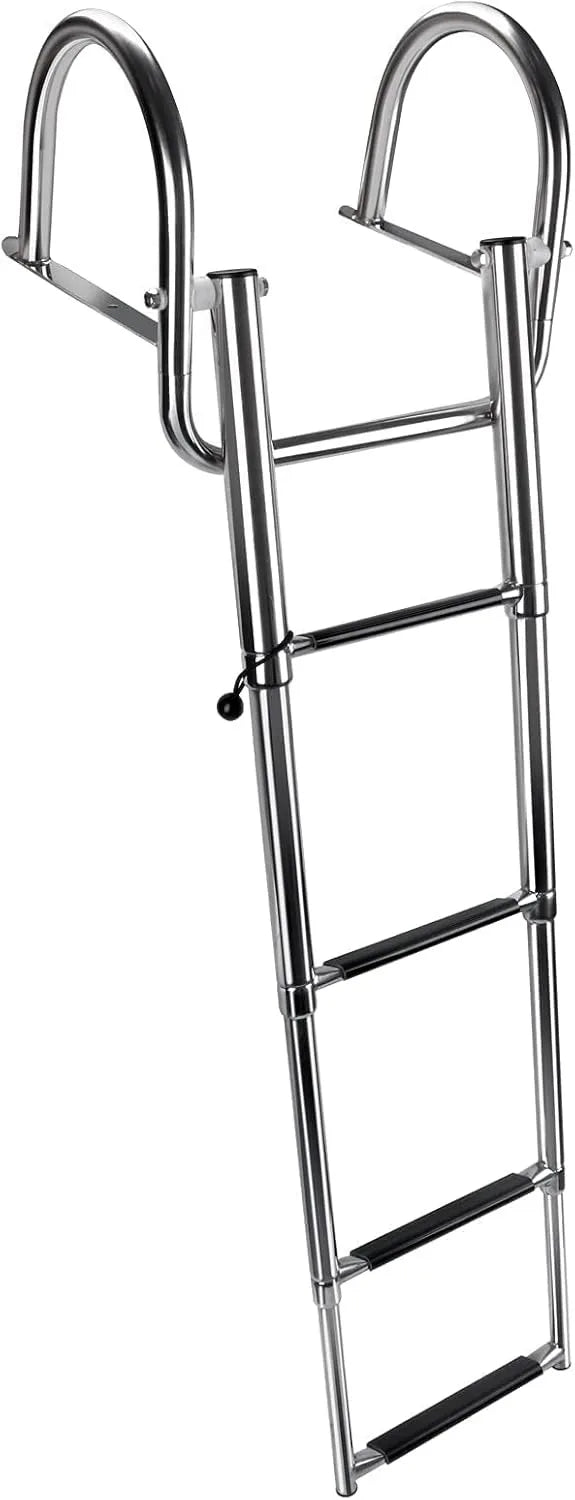 [Unique Functional Features]: Telescoping 316 stainless steel tubing, rear-entry design, and quick-release brackets for easy installation. Self-supporting structure requires no extra support. Bungee cord strap keeps the ladder stowed securely; supports up to 600 lbs.