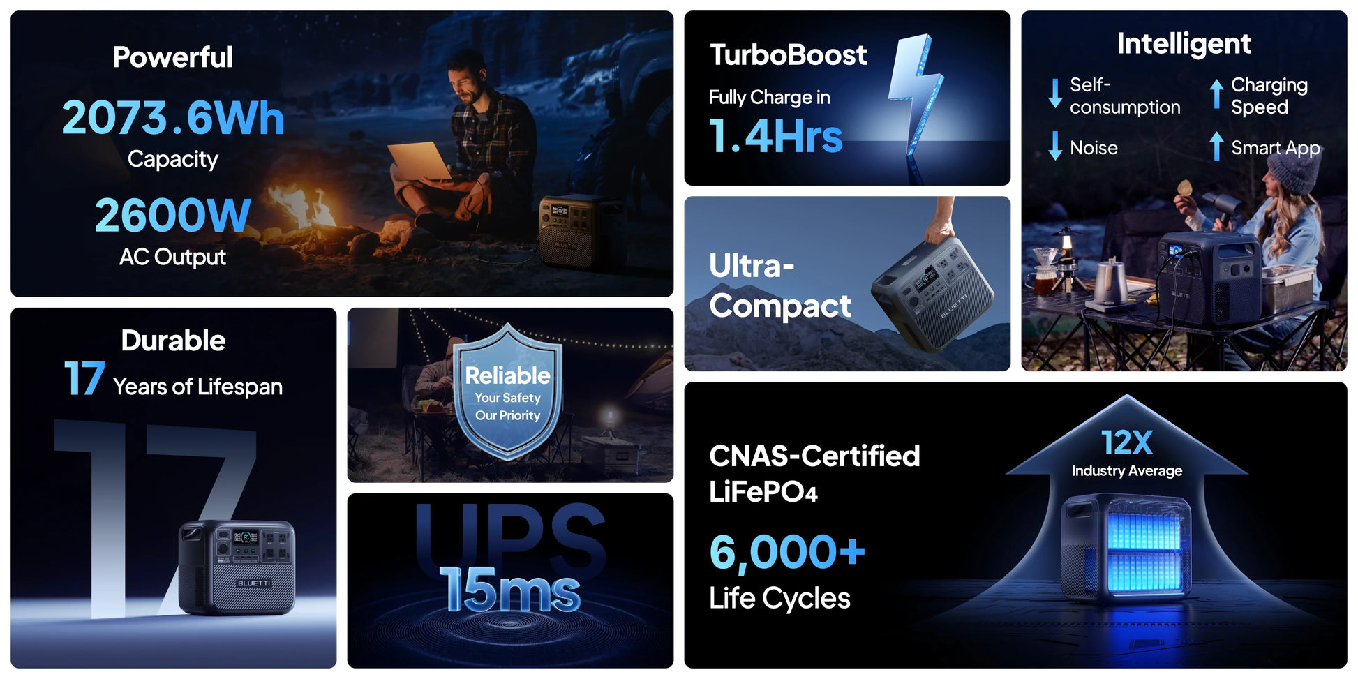 Wherever you are, experience lightning-fast charging that keeps your devices running without delay. The TurboBoost technology allows you to reach 80% charge in just 1 hour. While exploring the outdoors, you can access solar energy and get a full charge in about 2.4 hours. Even driving on the road, you can charge it efficiently via our latest innovation - BLUETTI Charger 1, which is 6X faster than conventional car chargers.