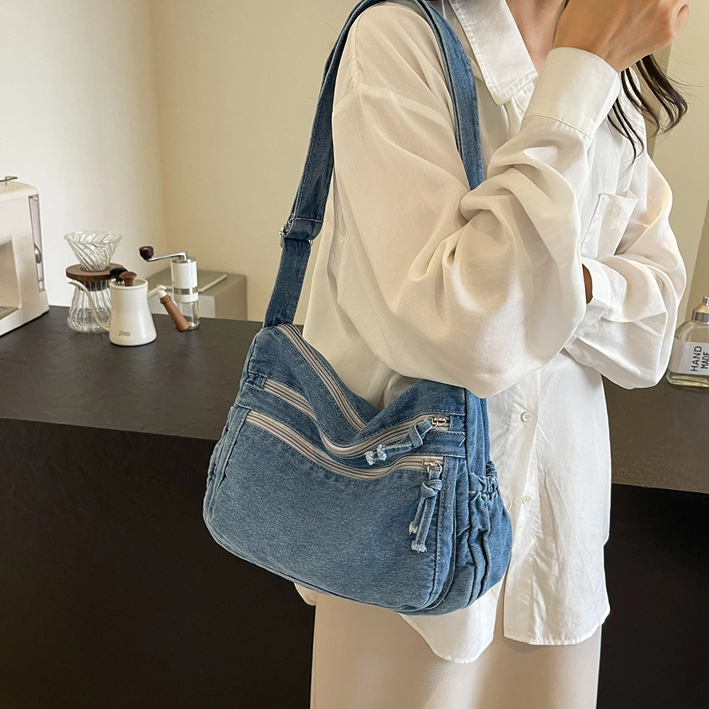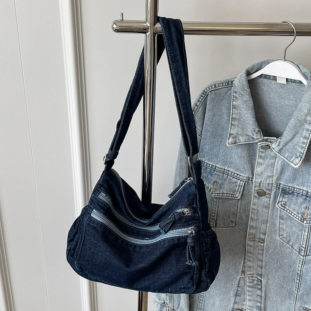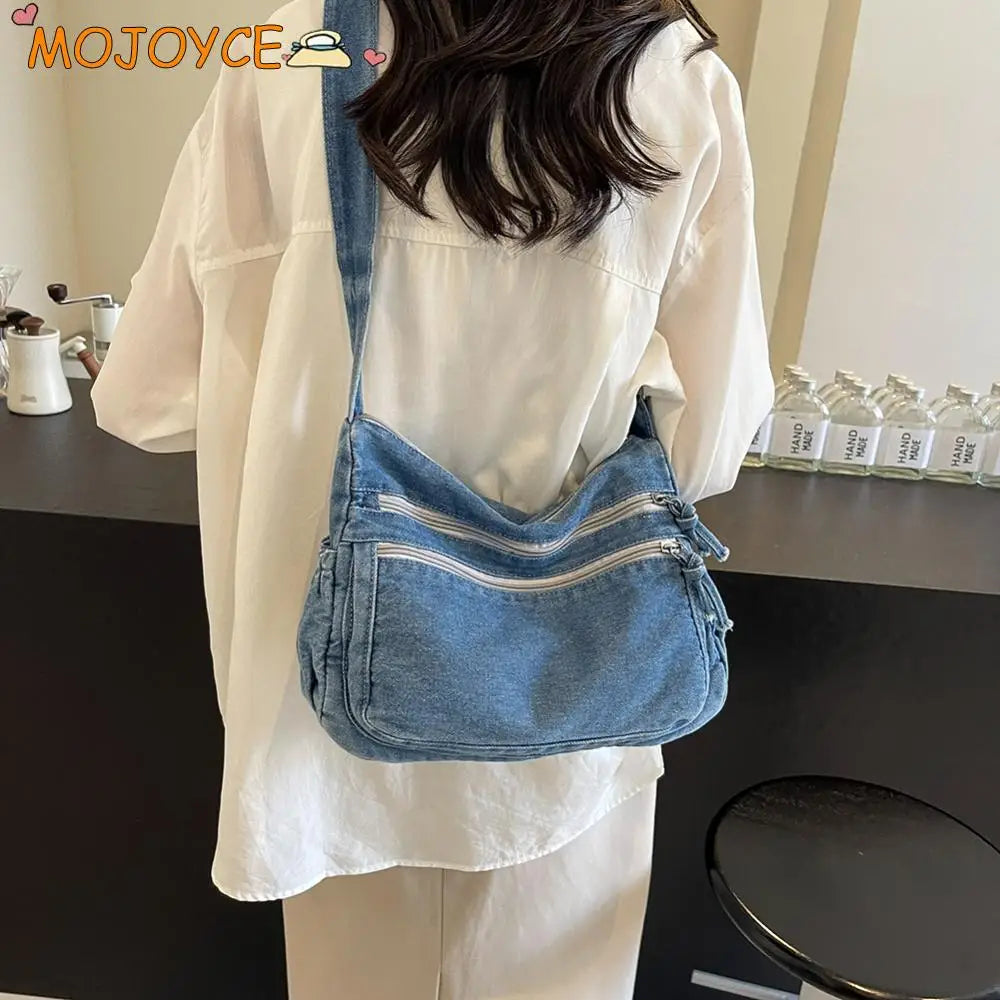 Vintage Denim Shoulder Bag Women's Large Capacity Messenger Bag Multi-pockets Satchel Bags Adjustable Strap Ladies Crossbody Bag