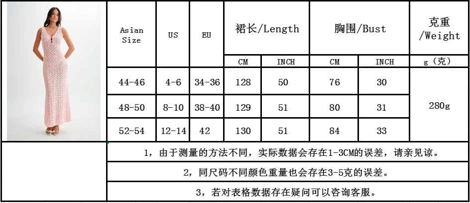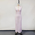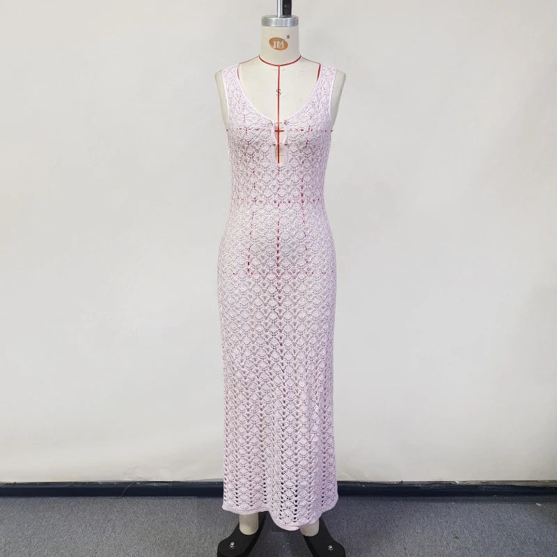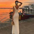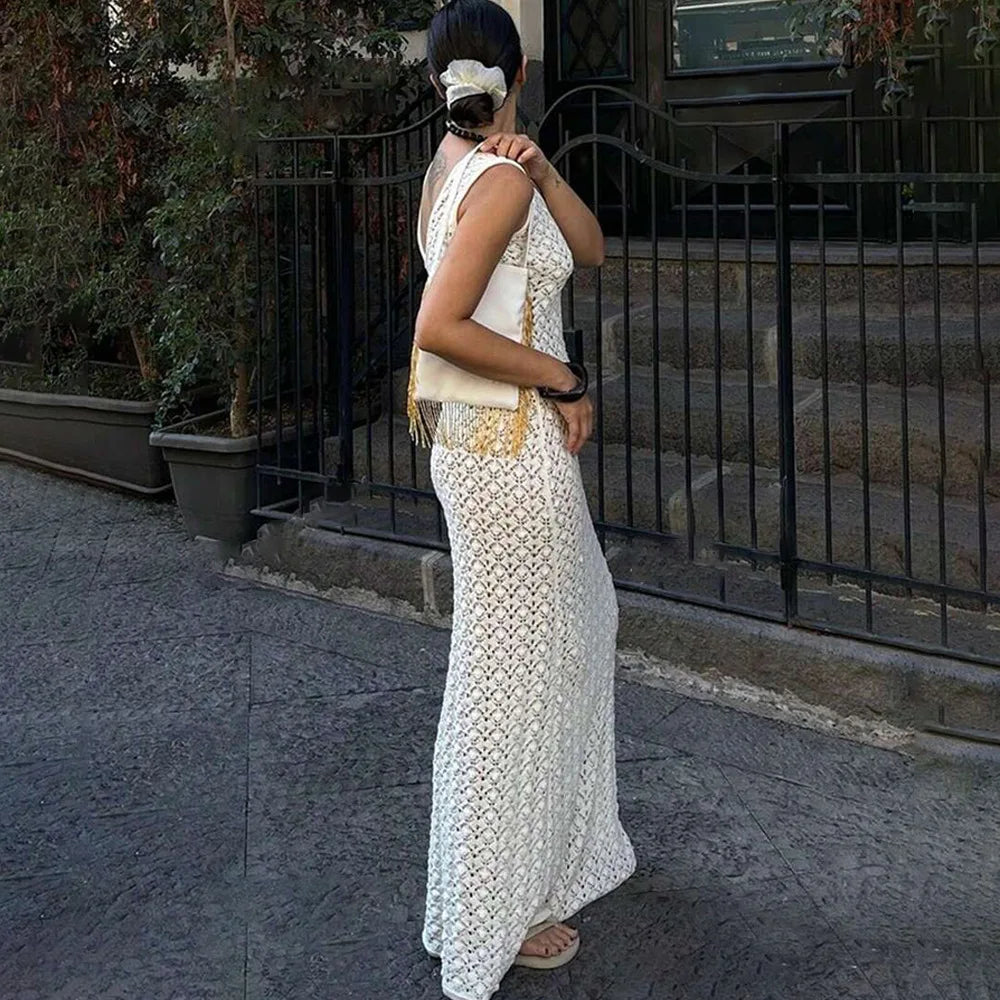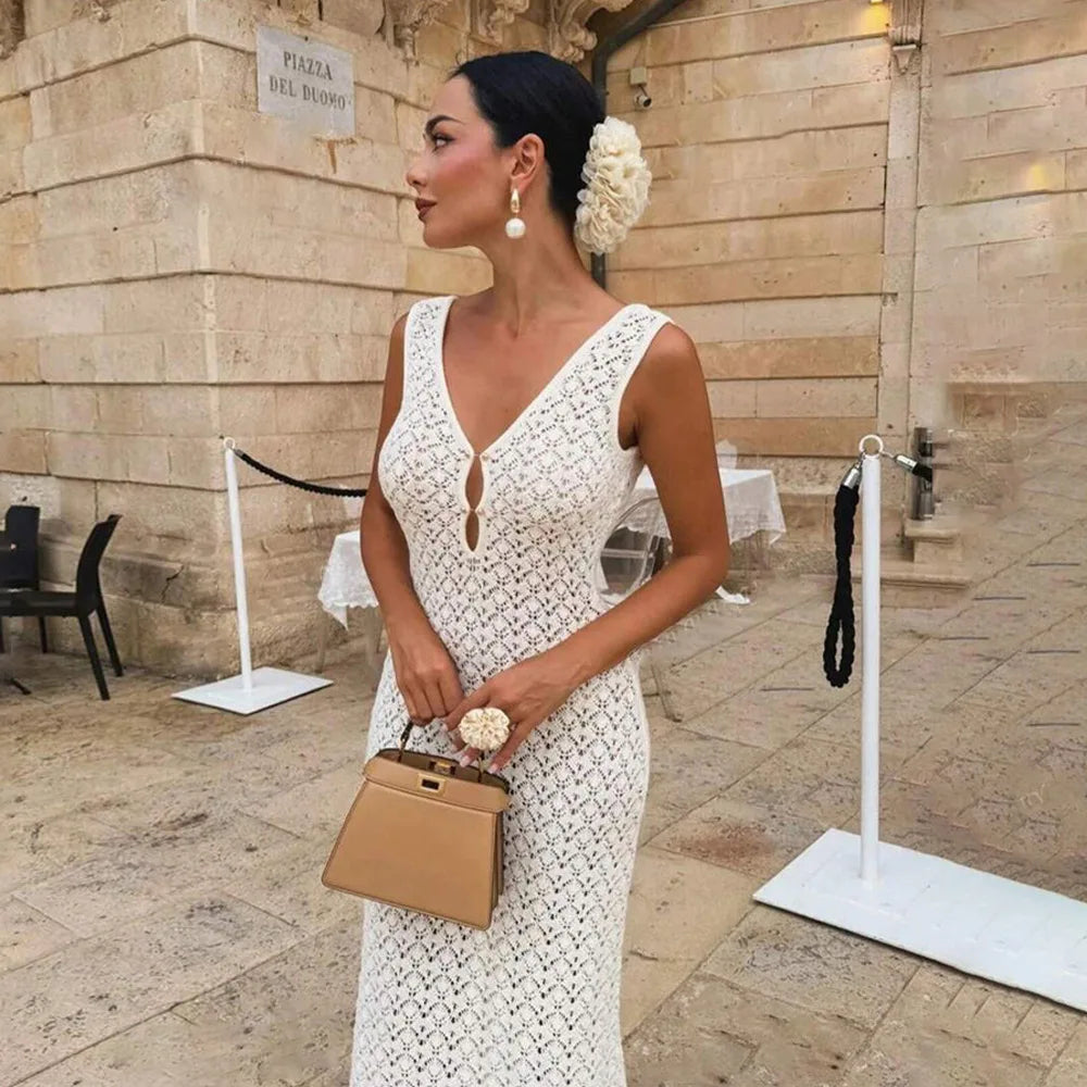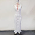 White Hollow Out Kintted Sexy Long Beach Dress for Women Elegant Chic V-neck Backless Sleeveless Holidays Party Dress 2025