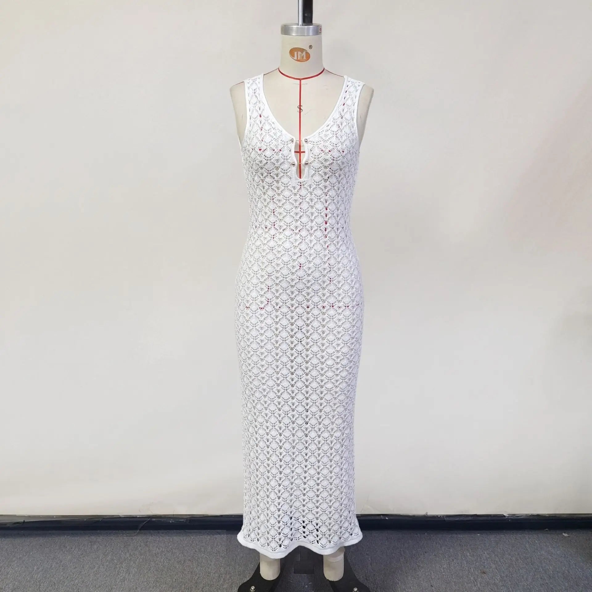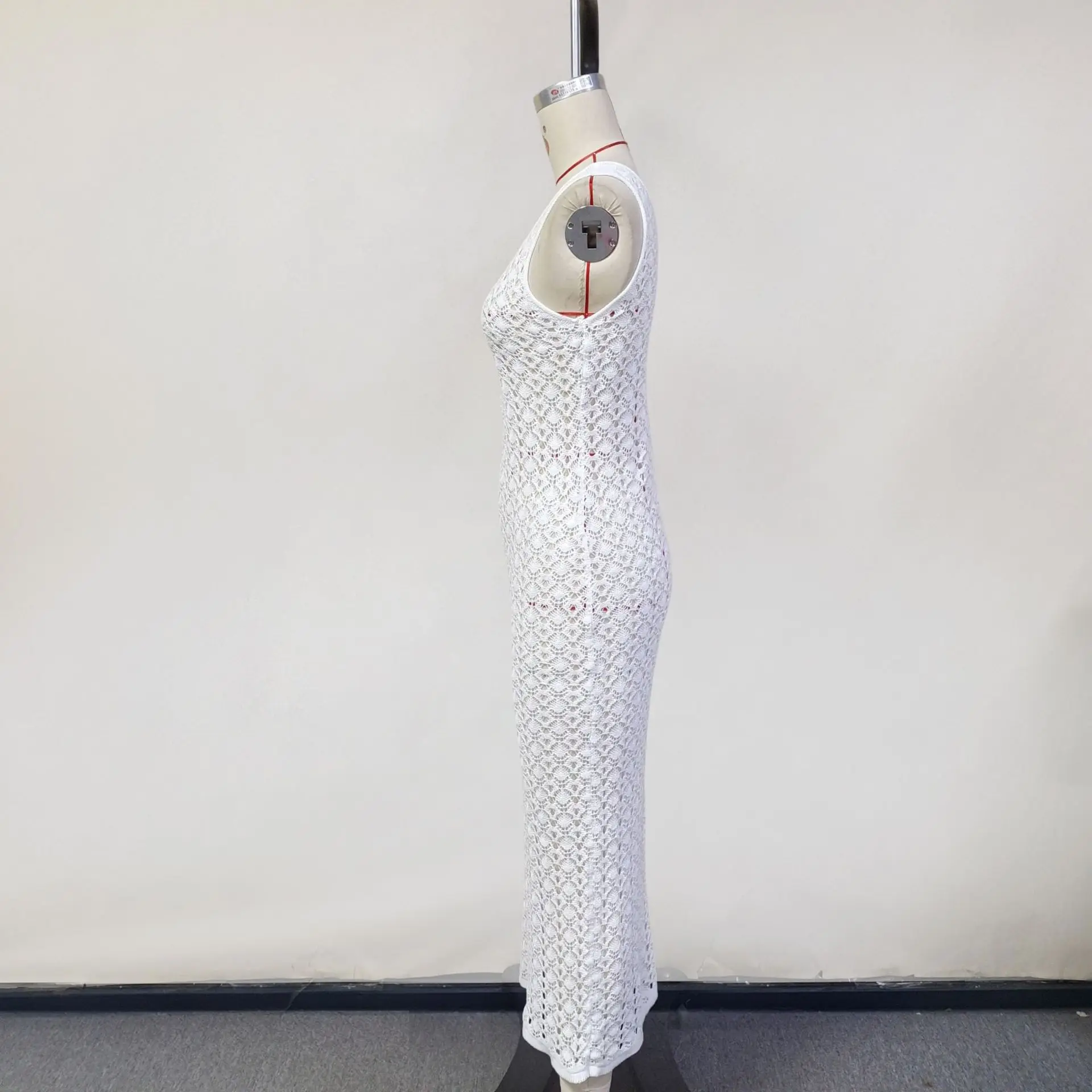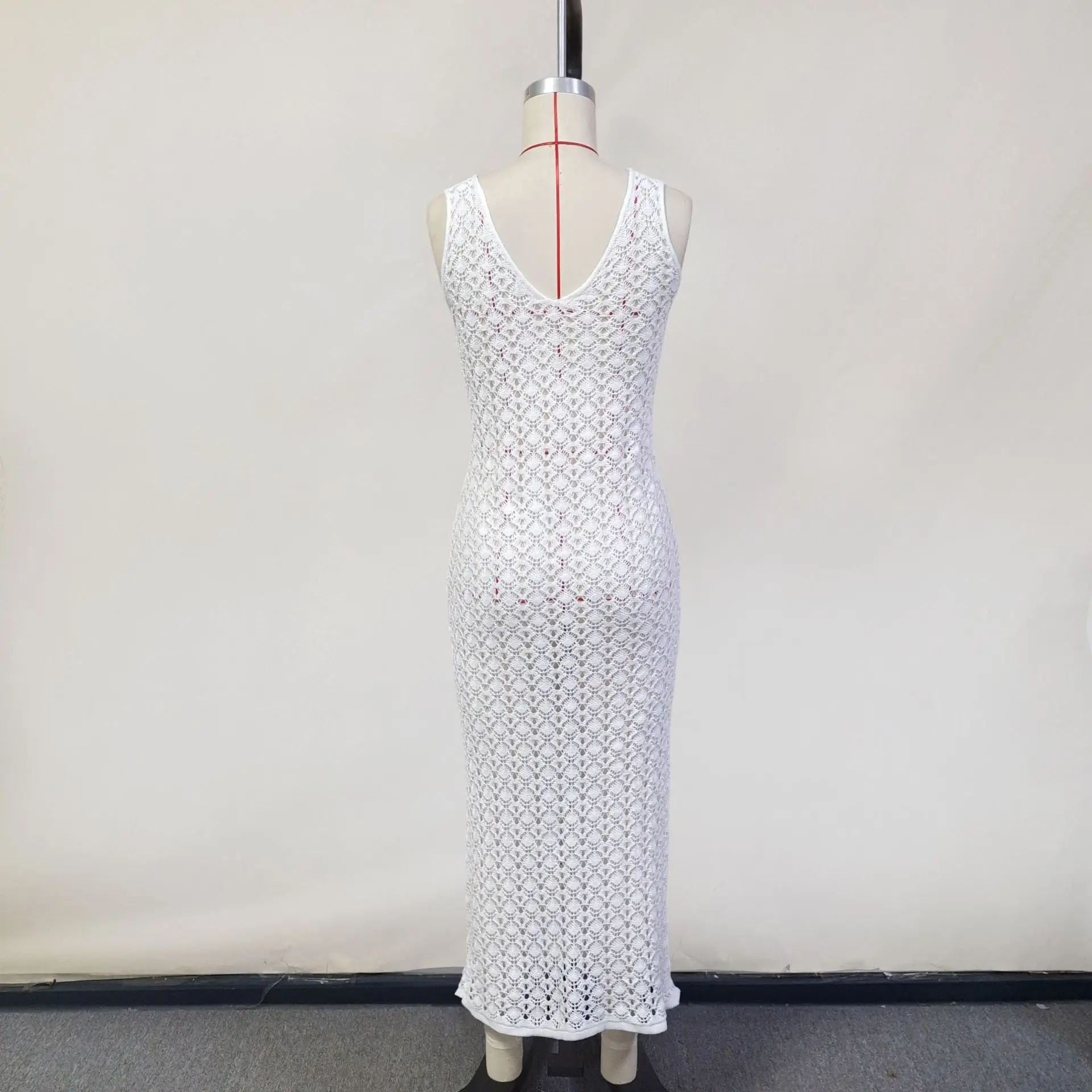 White Hollow Out Kintted Sexy Long Beach Dress for Women Elegant Chic V-neck Backless Sleeveless Holidays Party Dress 2025