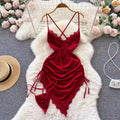 Women Sexy Red Ruched Mini Dress Sleeveless Backless Spaghetti Strap Dress Drawstring Bodycon Party Club Dress with Thong