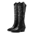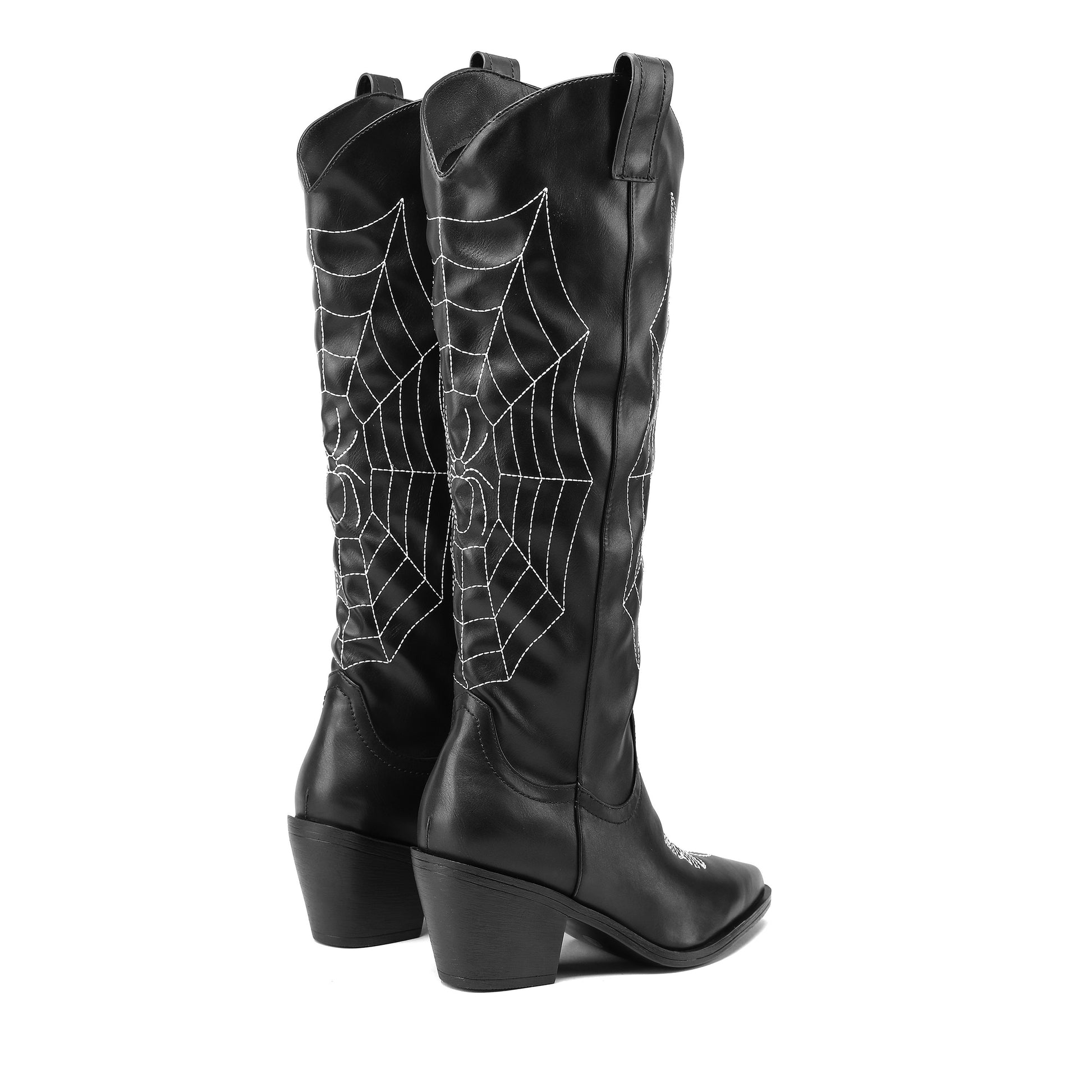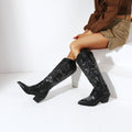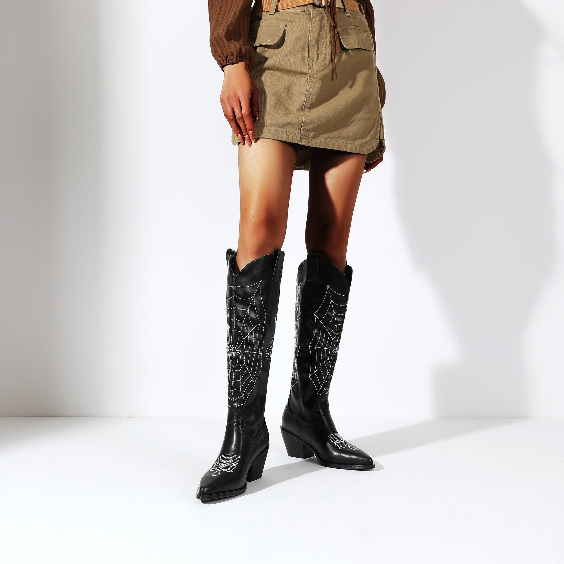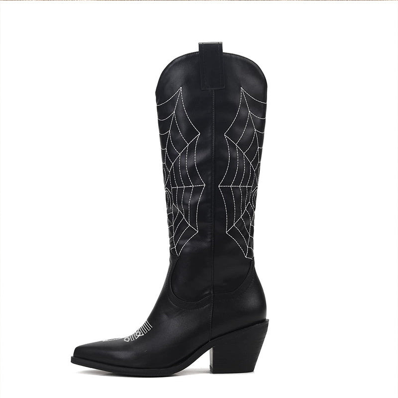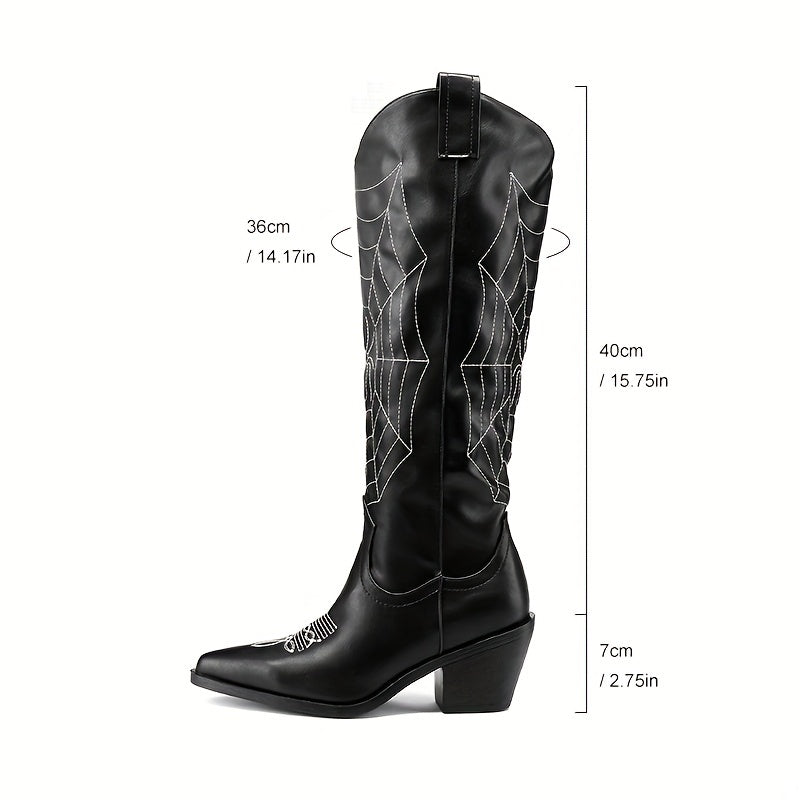 Women's Chunky Heel Spider Print Knee High Boots, Pointed Toe Solid Color Slip On Long Boots, Comfortable Shoes