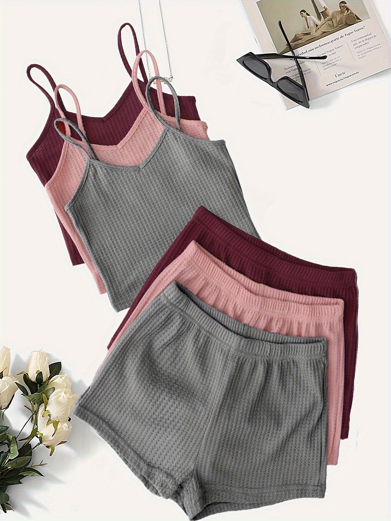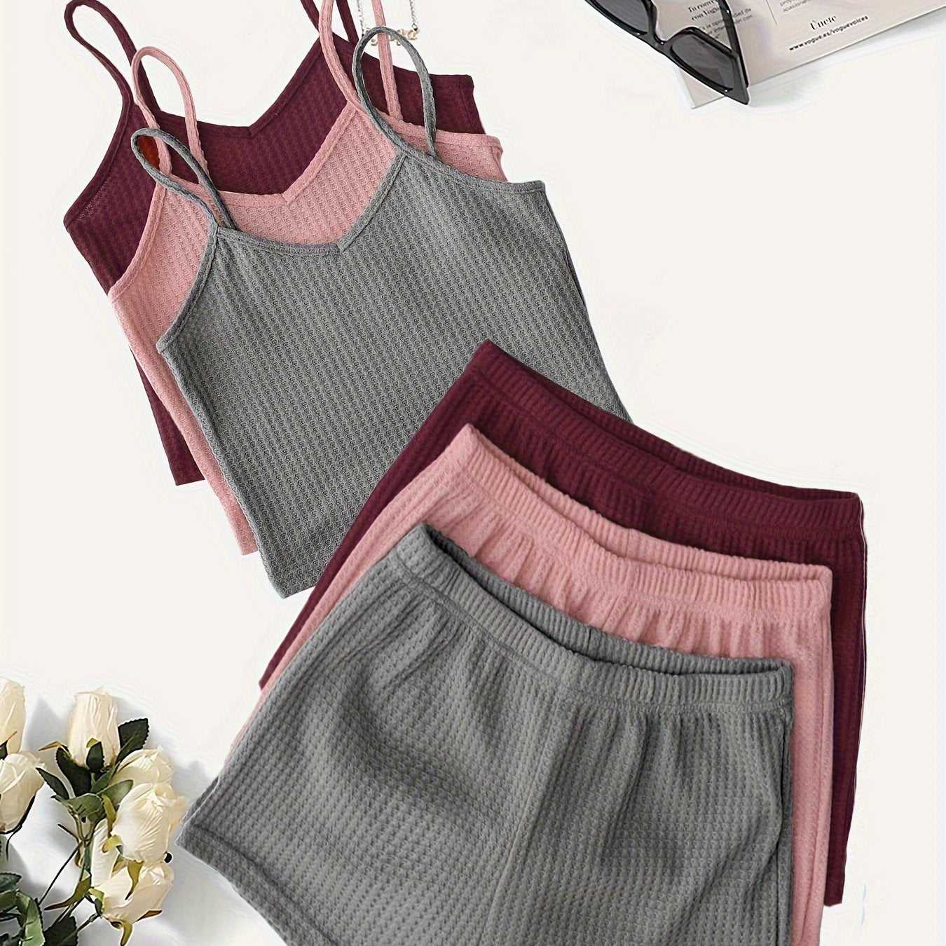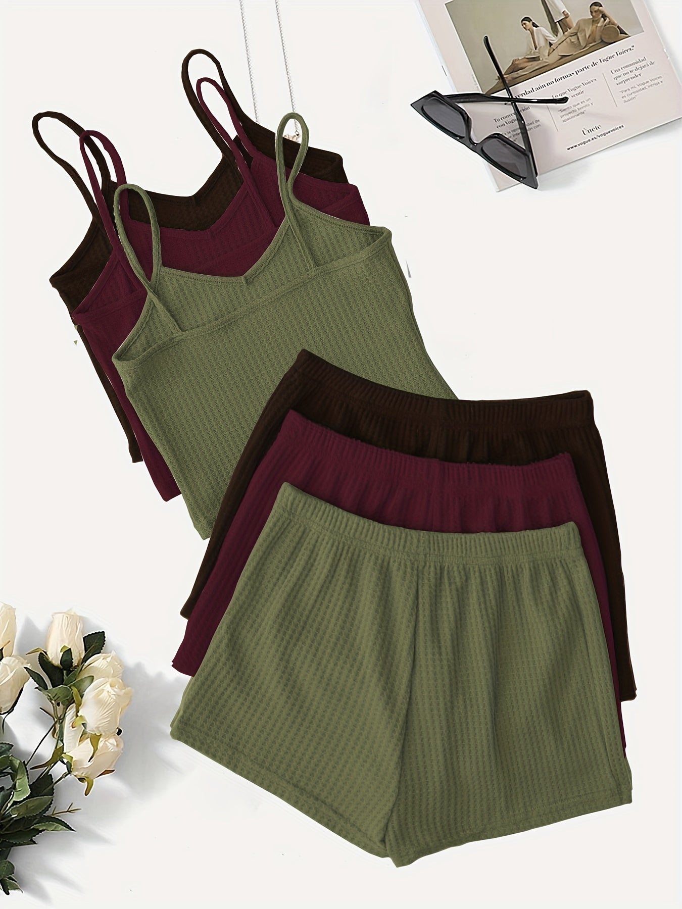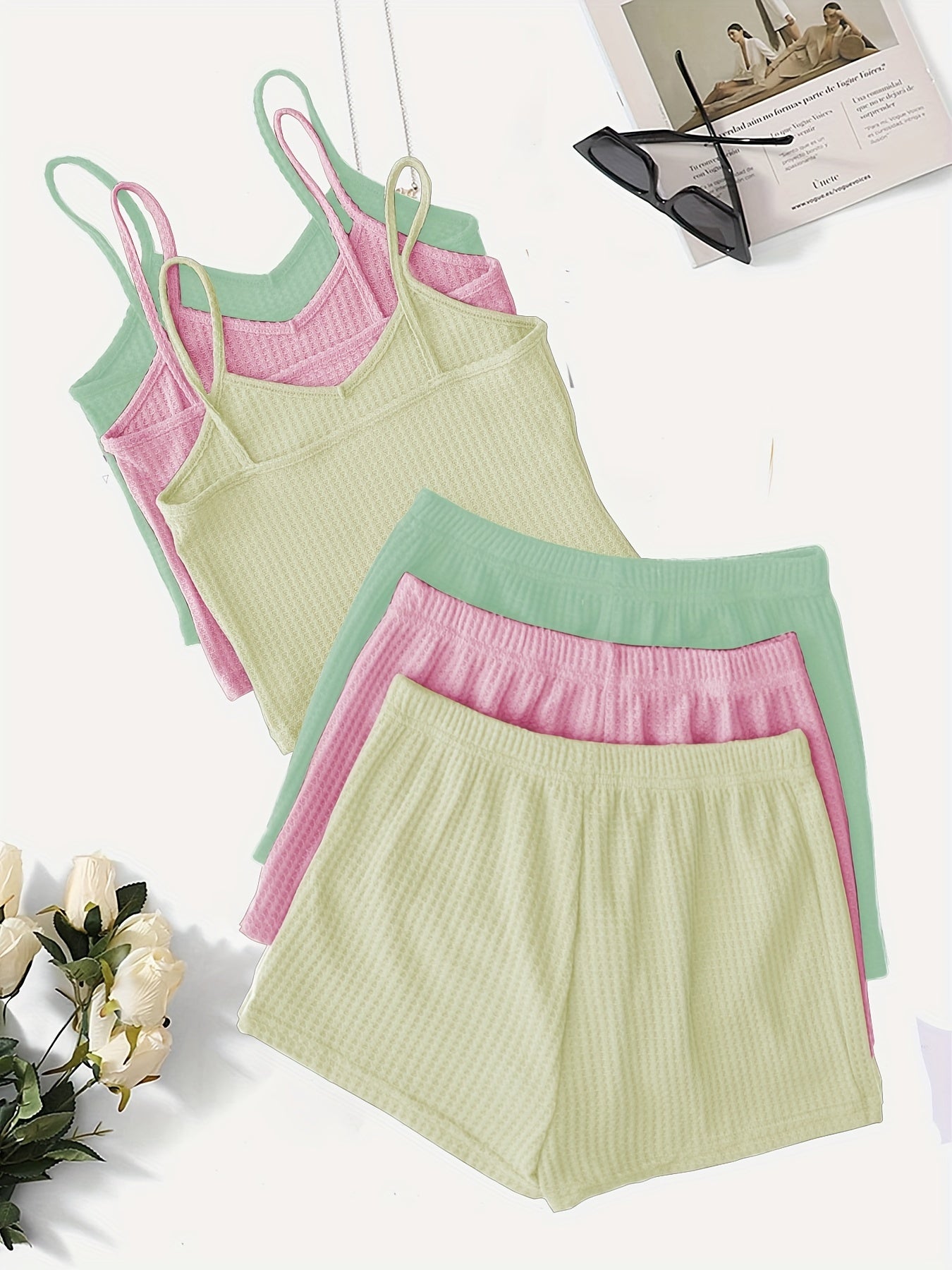 Women'S Elegant Waffle Cami & Shorts Set - Soft Pink & Mint Green, Sleeveless V-Neck Top with Ruffled Straps, High-Waisted Drawstring Shorts, Casual & Comfortable for Spring/Summer, Summer Outfit | Sleeveless Top | Texture