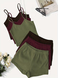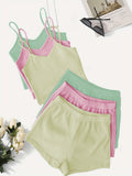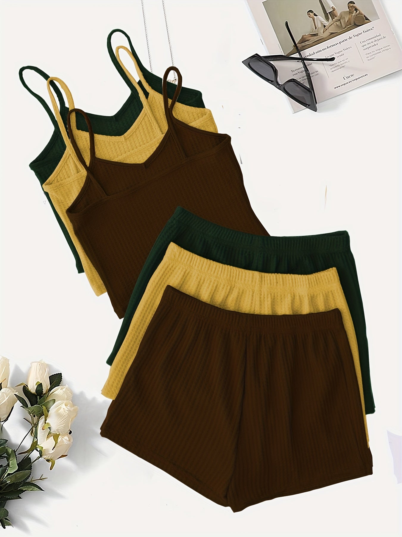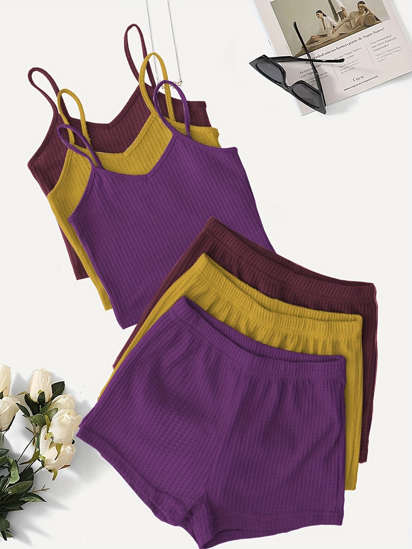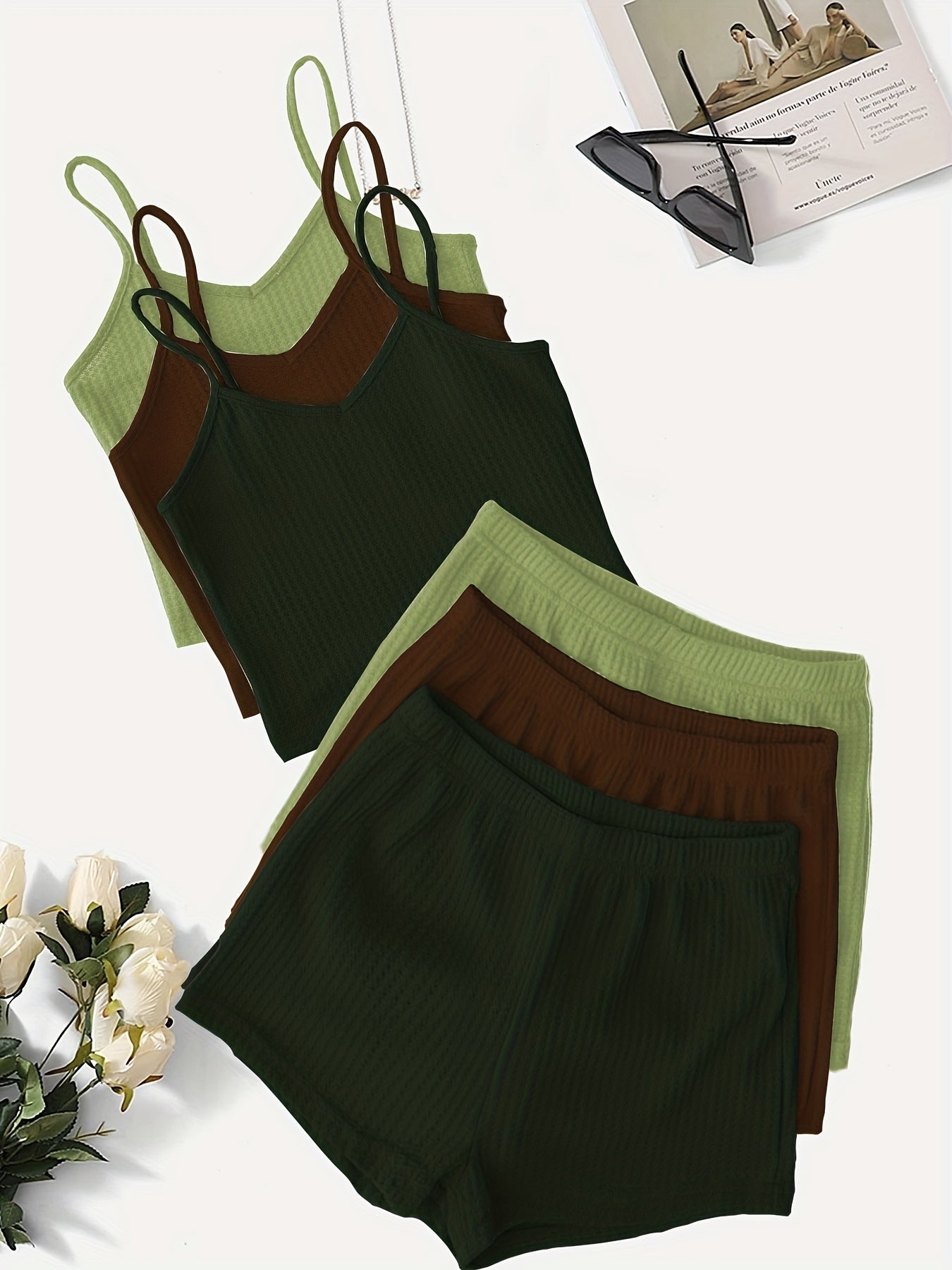 Women'S Elegant Waffle Cami & Shorts Set - Soft Pink & Mint Green, Sleeveless V-Neck Top with Ruffled Straps, High-Waisted Drawstring Shorts, Casual & Comfortable for Spring/Summer, Summer Outfit | Sleeveless Top | Texture