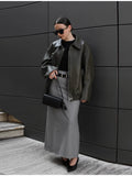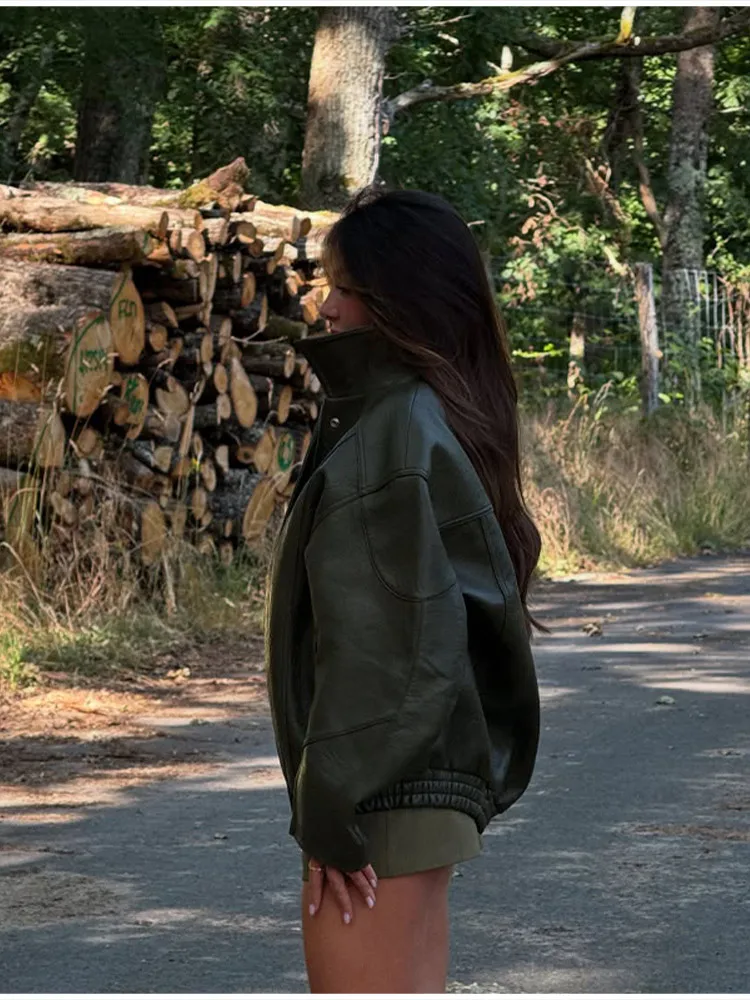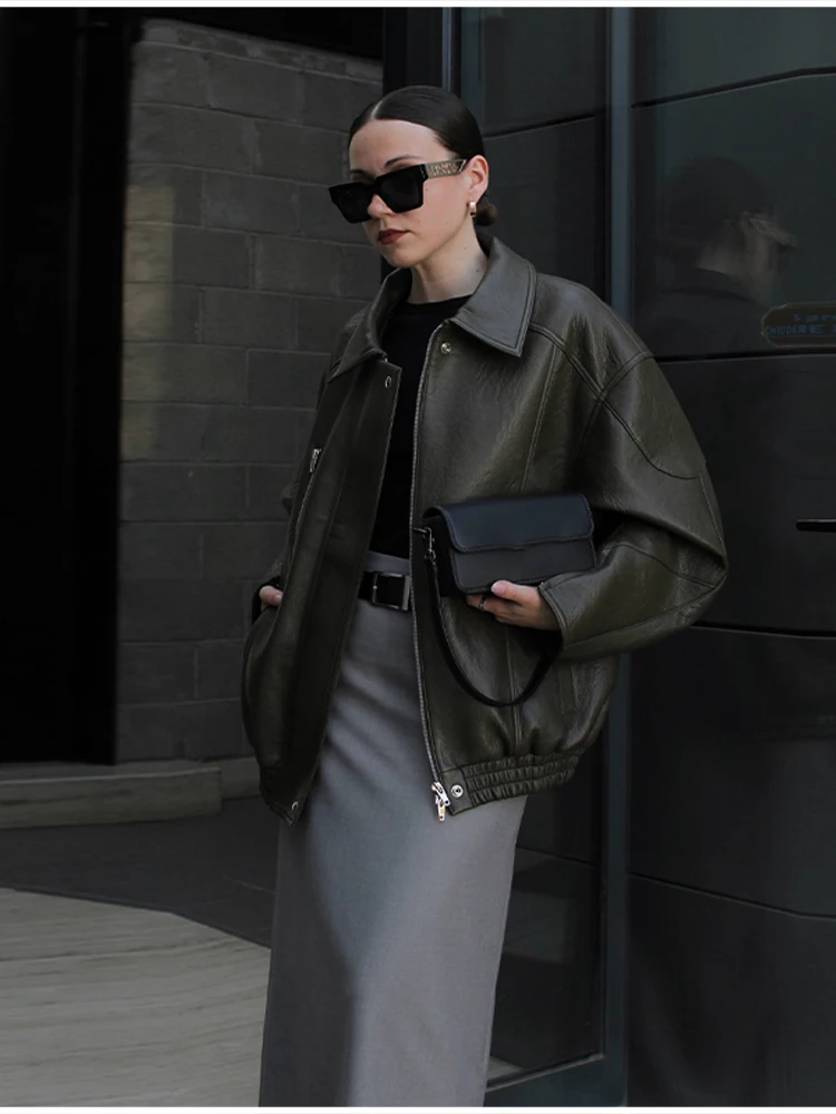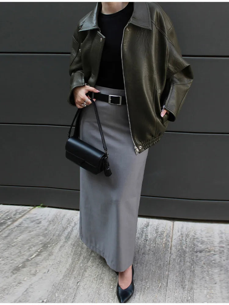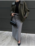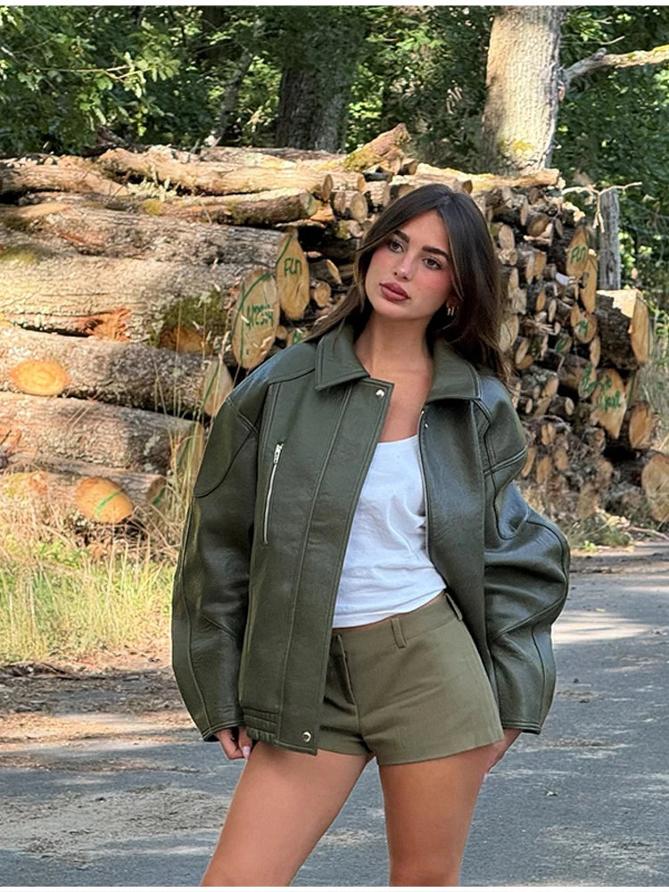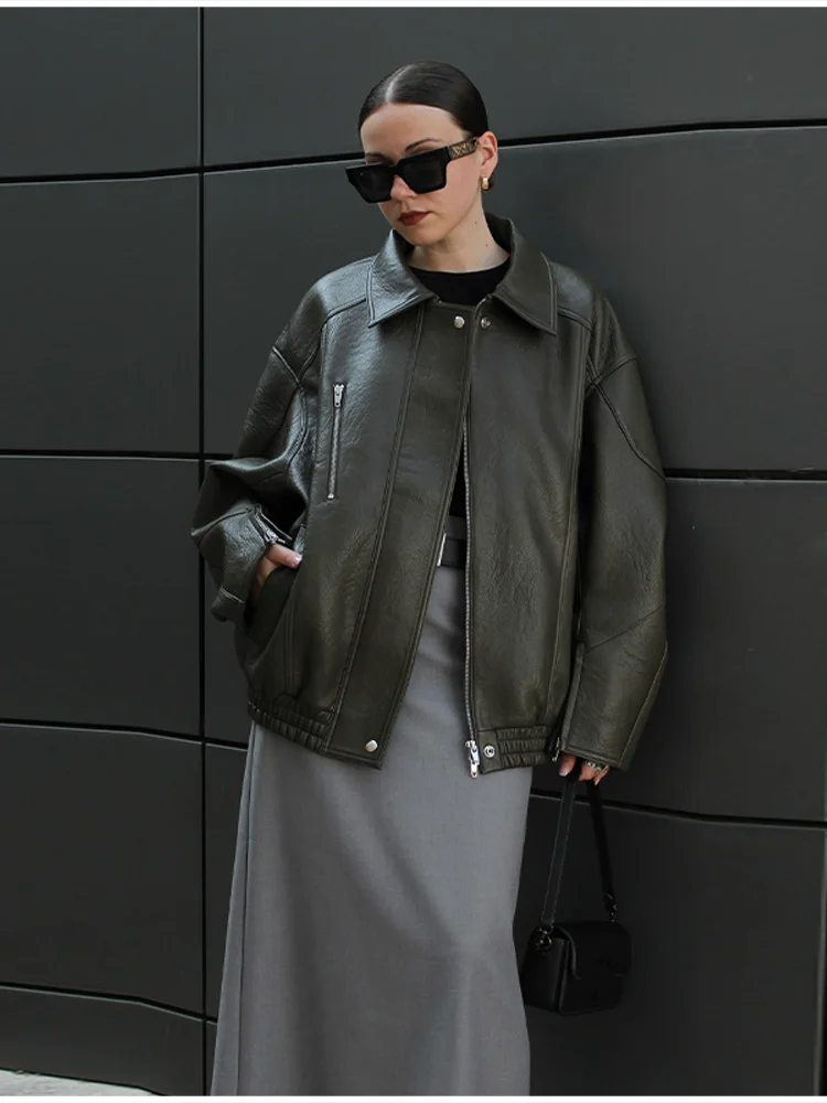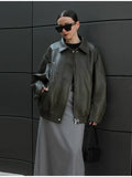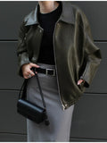 Women's Faux Leather Lapel Jacket Vintage Casual Long Sleeves Zipper Pockets Short Coat 2025 Autumn Lady Commute Streetwear