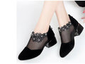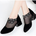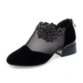 Women's Flower Rhinestone Mesh Block Heels, Fashion Back Zipper Solid, Versatile Dress Low Heels