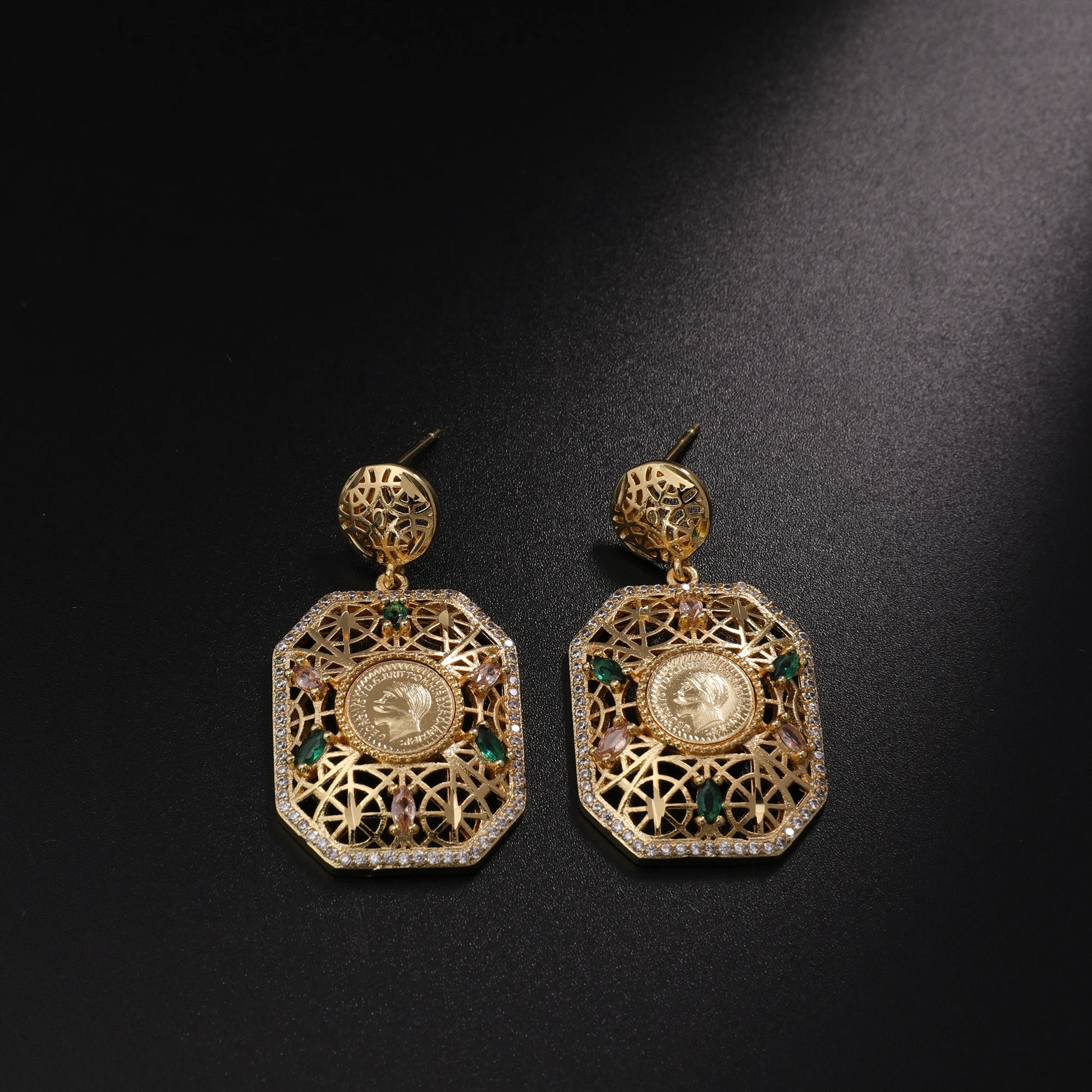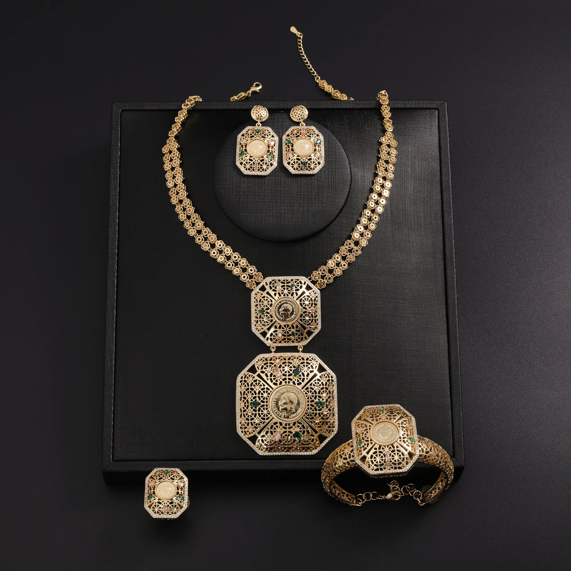 Women's Jewelry Set Dubai Nigerian Kuwaiti Bridal 24k Gold Plated Spinel Zirconia Human Head Ancient Coin Earrings Necklace Rin