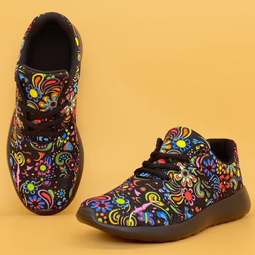 Women's Mexican Flower Pattern Lightweight Sneakers - Lace-Up Running Shoes, Casual & Stylish - Breathable Fabric & Rubber Sole - For Women - Suitable for Everyday Wear, Running & Casual Outings - Perfect Gift for Fashionable