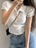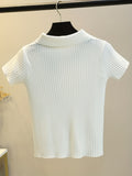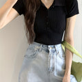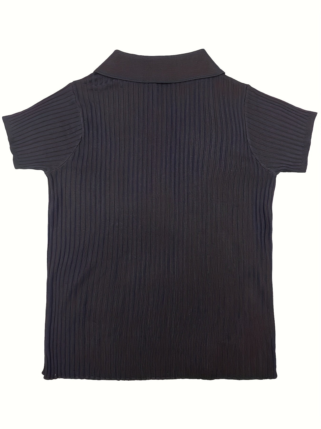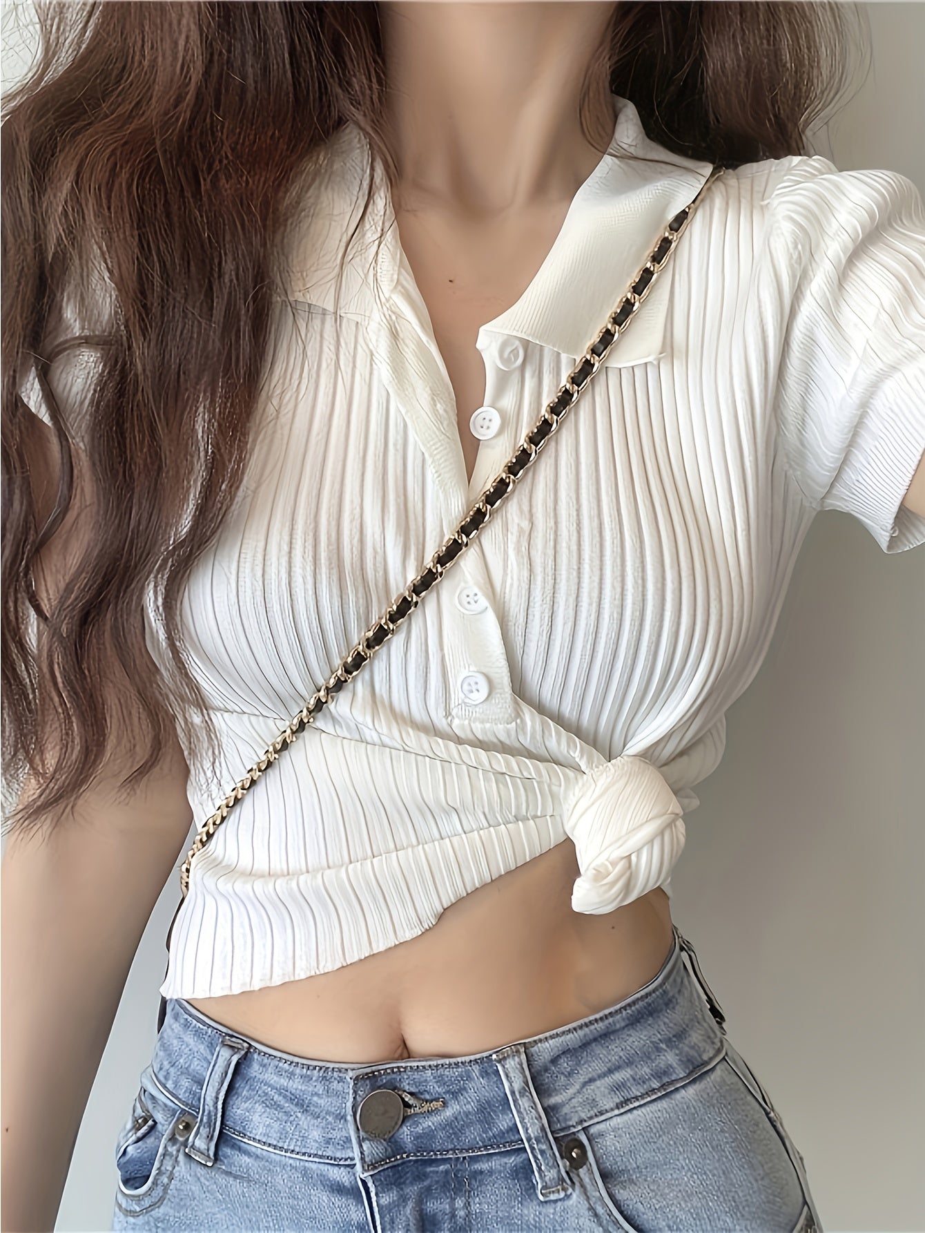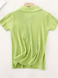 Women'S Summer Viscose Polo Shirt, Casual Solid Color Knit Fabric, High Stretch, Short Crop Top with Button Detail, 27% Polyester 27% Viscose 5% Spandex